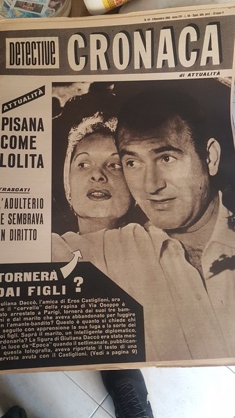 DISPONIAMO DEI SEGUENTI ANNI E NUMERI: IL PREZZO SE ACQUISTATI SINGOLARMENTE VIENE FATTO SU RICHIESTA IN BASE ALLA RIVISTA SCELTA. IL PREZZO INDICATO E' RIFERITO ALLE ANNATE DI CIRCA 20 NUMERI SENZA SCELTA, COMUNQUE CONTATTARE PER DETAGLI ANNO 1953 - N 12 LA DONNA UOMO - N 15 FRED IL SANGUINARIO,AFFRONTO DEL GUAPPO GENNNARINO - N 18 IL BANDITO GIULIANO MADDALENA - 22 NANCY HAWKINS, ERGASTOLI AI 45 DELLA GIULIANO - N 27 BANDA PASTORE SALVATORE FERRERA - N 35 RIGOLETTO HA UCCISO - N 41 LA BELVA DI PARASPOLA - ANNO N 1954N 2 MILANO GANGSTER A BORDO DI UNA 1400 NERA - N 3 ENZA SOLDI CAUSA A TOGNAZZI - N 9 MILANO SCANDALO SQUILLO - N 15 ELISABETTA CONOBBE IL PADRE DEL BIMBO DI ADRIANA BISACCIA - N 20 IL TESORO DEL MISTERIOSO NAZISTA ANTONIO HORMANN - N 21 CANNONIERA ITAIANA BRACCO SALVA EQUIPAGGIO DI UN PESCHEREGGIO ABBORDATO DA UNA SILURANTE SLAVA - N 25 SIGNORA LOCATELLI INSUCCESSO DI FAUSTO COPPI ACCUSATA - N 28 CARRI ARMATI E MITRGLIATRICI PER CATTURARE UN POVERO NEGRO -N 29 DON CALOGERO VIZZINI VITA E MIRACOLI RE DELLA MAFIA - N 33 BRUNO MERAZZI PUGILE CONDANNATO - N 37 MISTERO TORVAJANICA - N 40 MARILYN MONROE ACCUSA JOE DI MAGGIO - N 42 STORIA DEI PERICOLI PUBBLICI RACCONTATA DA UNO DI LORO, JACK LEGS DIAMOND - N 45 BERGAMO NOTTE DI SANGUE FATTORIA DEL SILENZIO - N 46 PERMESSO SPECIALE PER SPOSARE DODCENNE IN ATTESA DI UN BAMBINO - N 48 ELEONORA ROSSI DRAGO MINACCIATA - ANNO 1955 N 3 STRAGE DI ANCONA - N 5 SERGE RUBINSTEIN NOTO FINANZIERE UCCISO - N 7 MARIO D'AGATA PUGILE SORDOMUTO FERITO PRIMA DELL'INCONTRO MONDIALE - N 13 PATRICIA WARD ACCUSA MINOT JELKE DETTO MICKIE MARGARINA - N 14 HEDY LAMAR IL TRIBUNALE DOPO 25 ANNI DECIDE PER LA PROIEZIENE DEL FILM CON SCENA DI NUDO - N 15 MARYLIN MONROE NEI GUAI GUIDA SENZA PATENTE - N 21 FURTO AL CARROZZONE COMPAGNIA DEL TEATRO CITTA DI BOLZANO VITTIME GERMANA MONTEVERDI FANTASIO PICCOLI - N 23 ESTELLA GARDNER SERGE RUBINSTEIN - - N 25 MOSTRO DI PRESINACI - N 26 PROCESSO PAPINI MERLO GIALLO - N 28 RANDAZZA OMICIDIO SANTA SPITALERI , IL CANNIBALE DI LANCIANO - N 32 PROCESSO AL CALCIO SCANDALI NEL MONDO DEL PALLONE SQUALIFICHE A VITA DI GIOCATORI E PRESIDENTI. TRA CUI GIUSEPPE RIZZO PRESIDENTE CATANIA - ANNO 1956n 5 CHI HA UCCISO MARIA ROMANELLI, I 30 ANNI DI CARCERE DI LEOPOLD NATHAN - N 7 ALBERTO SORDI - N 8 MADALEINE LA DONNA DEL BANDITO MACRI'- n 9 PAT WARD CASIO JALKE - N 10 PAOLINA CALVO CASE CHIUSE, RAZZISMO MADE USA, REGINA DEL RODEO POLLY MCGOWAN - N 12 I DELITTI DELL'APE REGINA - N 13 WALTER CHIARI E COLETTE MARCHAND - N 14 GINA LOLLOBRIGIDA CENSURATE FOTO - N 22 MISTERO CADAVERE SCOGLIERA DI TAORMINA, CASI FAMOSI SACCO E VANZETTI, IL CASO MONTANARI PROCESSO NICOLA CALBI - N 23 I VAMPIRI DEI CIMITERI - N 27 I DELITTI DELLA MAFIA - N 28 I PILOTI DELLA COCA MARIA KOPACS EUGENIO COGNI - N 30 LE PRIME DROGHE SCIENTIFICHE - N 31 RUTH ROMAN DISASTRO ANDREA DORIA ANNO 1957 N 12 AFA GIUBELLI UCCIDE IL SINDACO DI CREVACUORE - N 16 MISTERO PROCESSO WILMA MONTESI - N 19 NEW YORK ATTENTATO A COSTELLO - N 22 CLAUDIO MORO RAPINATORE - N 39 DELITTO GALLAND - N 41 ZINGARI COME POVERI NEGRI - N 42 LA STRAGE DI MONCALIERI - N 45 DISGRAZIA NELLA ACQUE DI MAZZARO TAORMINA MICHELE BOLESLAVA ORLOWSKA - N 46 SHIRLEY BASSEY - N 47 -ANNO 1958 - N 6 IL MOSTRO DEL NEBRASKA, NUMERO DEDICATO ALLE CASE CHIUSE - N 7 LONDRA PROSTITUTE E FISCO - N 8 NUMERO DEDICATO AI PROTETTORI, ROMA E PROSTITUZIONE IL MONDO DEI 'PAPPA', SANGUE A BORDO DEL VICTORIA - N10 INCHIESTA SFRUTTATORI PROSTITUZIONE - N 14 UCCISO IL MAGO ERMENEGILDO ORLANDELLI - N 16 PROTESTA DELLE SUORE FRANCESCANE MISSIONARIE PERCHE ANNA MAGNANI NEL FILM DI CAMERINI INDOSSA GLI ABITI DEL LORO ORDINE - N 18 CHERYL LIBERA SENTENZA, BARBARA KOHLER TERRORE A BERLINO - N 20 PROCESSO ALLE TUTE BLU, COLPI SENSAZIONALI - N 21 - 22 SOPHIA LOREN ASTA FOTO AUDACI - N 29 CASO DIABOLICH, GINNY DOCKERY - N 31 JAYNE MANSFIELD - N 36 SILVANA PAMPANINI, MICKEY COHEN, INCHIESTA AI FLIPPERS SARANNO MESSI FUORI LEGGE - N 40 - N 41 PETER HEIDRUN, PAUL REITER CLAMOROSO PROCESSO - N 42 KATYNA RANIERI, LOLITA MORALES - N 44 GINA LOLLOBRIGIDA SCANDALO PRRUCCA - N 50 CASO FENAROLI - N 51 CASO MONTESI - N 52 MAGISTRATURA IL SISTEMA NON FUNZIONA, CASO FENAROLI -ANNO 1959 N 2 PROCESSO RE DELL'ASPROMONTE MACRI - N 3 SOPHIA LOREN CARLO PONTI COCUBINAGGIO - N 6 L'AFFARE LACAZE SCANDALO FRANCESE JEAN PIERRE GUILLAME - N 7 PERCHE GLI ITALIANI ODIANO LA POLIZIA - N 8 CASO ROGGIA BERTONICA, BRIAN DONALD HUE PERICOLO PUBBLICO, FOTO DI LOCOROTONDO - N 12 AFFARE LACAZE - N 17 RIVOLTA AMMUTINAMENTO CARCERE DEL MONTANA - N 19 PROCESSO TOTO PUPA - N 22 IL COSTUME DA BAGNO E LA LEGGE INCHIESTA BRIGITTE BARDOT - N 23 FRANCOISE SAGAN BUONGIORNO TRISTEZZA LIBRO - N 24 LAURA GRIMALDI LASCIA O RADDOPPIA CAMPIONE BOFFITO - N 26 PALERMO UN MORTO AL GIORNO LA FATA DETTO MIMIDDU E SCAGLIONE - N 28 MARISA DEL FRATE - N 30 MISS ITALIA MARIA GRAZIA BUCCELLI, FALSARI D'ARGENTO A ROMA MILIONI IN MONETE - N 31 SOPHIA LORE E CARLO PONTI ADULTERIO - N 32 KIM CAPRI E ONOREVOLE ACHILLE LAURO, MAURIZIO ARENA - N 33 PRINCIPE DON VITTORIO MASSIMO DI ROCCASECCA DE VOLSCI E DAWN ADDAMS - N 35 CATANIA LINCIAGGIO VIGILE POSTEGGIATORI ABUSIVI - N 37 FOTO MIRABELLA IMBARCARI, INCHIESTA TEPPISTI, IL TERRIBILE BRAGANTIN - N 38 ORGOSOLO CORLEONE FUCILI PER UCCIDERE LA LEGGE, PROBLEMA TERRONI DELITTI - N 39 ANITA EKBERG - N 40 ALLAN DRAKW JANICE HANSEN - N 45 AL CAPONE BATTE MUSSOLINI - N 44 CHESSMAN CARYL FRANCES COUTERIER - N 48 DRACULA DI GENOVA, ROMA FOTO LUOGO DELITTO UCCISIONE MONDANA - N 49 INCHIESTA SUI VAMPIRI - N 50 INCHIESTA VAMPIRI - ANNO 1960 N 3 FAUSTO COPPI MORTE DUBBI SUL FIGLIO - N 4 SCANDALO PRINCIPESSE GIOVANNA PIGNATELLI D'ARAGONA CORTEZ GEORGE BREHAT, SPOGLIARELLISTE GERARD JACQUELINE JANET MAURIEL -N 5 PATRIZIA DELLA ROVERE, MARILYN MONROE ADOTTATA E POI RESPINTA - N 8 CASO CHESSMAN, INNAMORATA DI GHIANI, ROMA SCANDALO COCCINELLE QUESTE DONNE SON UOMINI TRANS TRAVESTITI, PROCESSO AL CODICE MAGISTRATURA - N 15 CRISTINA GAJONI MARITO SACERDOTE, ANGELA PORTALURI,