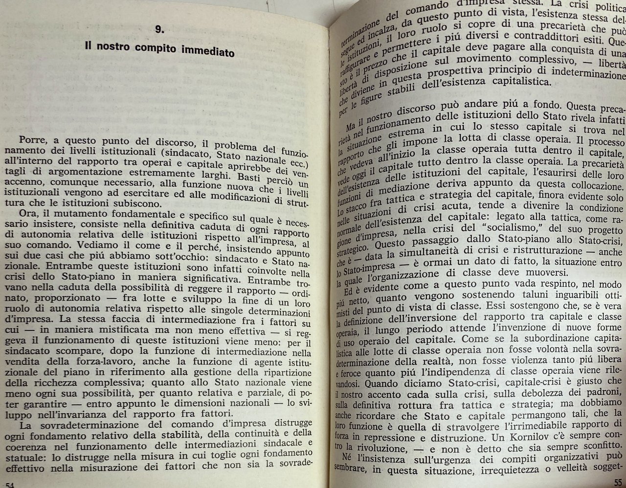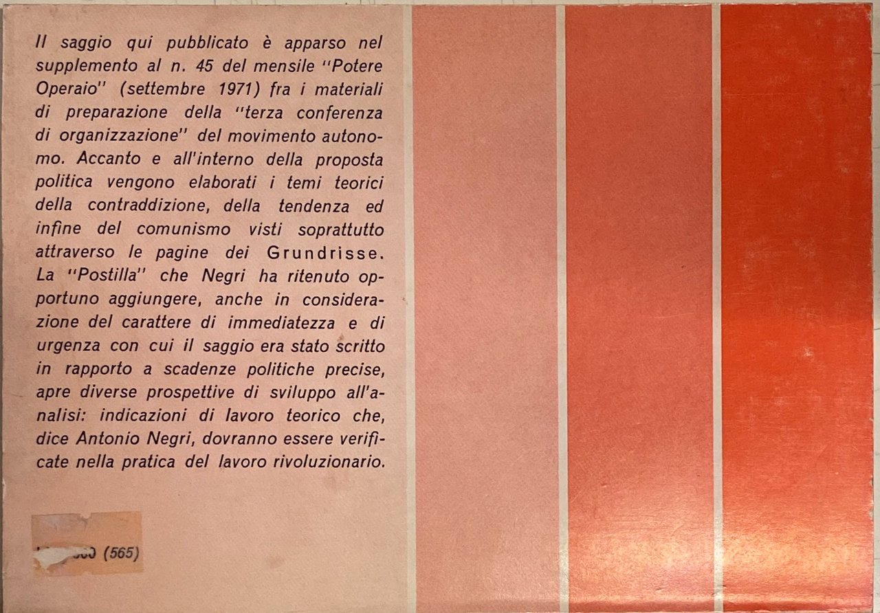 Il saggio qui pubblicato è apparso nel supplemento al n. 45 del mensile Potere Operaio (settembre 1971) fra i materiali di preparazione della terza conferenza di organizzazione del movimento autonomo. Accanto e all'interno della proposta politica vengono elaborati i temi teorici della contraddizione, della tendenza ed infine del comunismo visti soprattutto attraverso le pagine dei Grundrisse. La Postilla che Negri ha ritenuto opportuno aggiungere, anche in considerazione del carattere di immediatezza e di urgenza con cui il saggio era stato scritto in rapporto a scadenze politiche precise, apre diverse prospettive di sviluppo all'analisi: indicazioni di lavoro teorico che, dice Antonio Negri, dovranno essere verificate nella pratica del lavoro rivoluzionario.