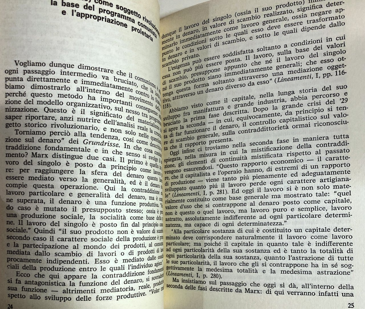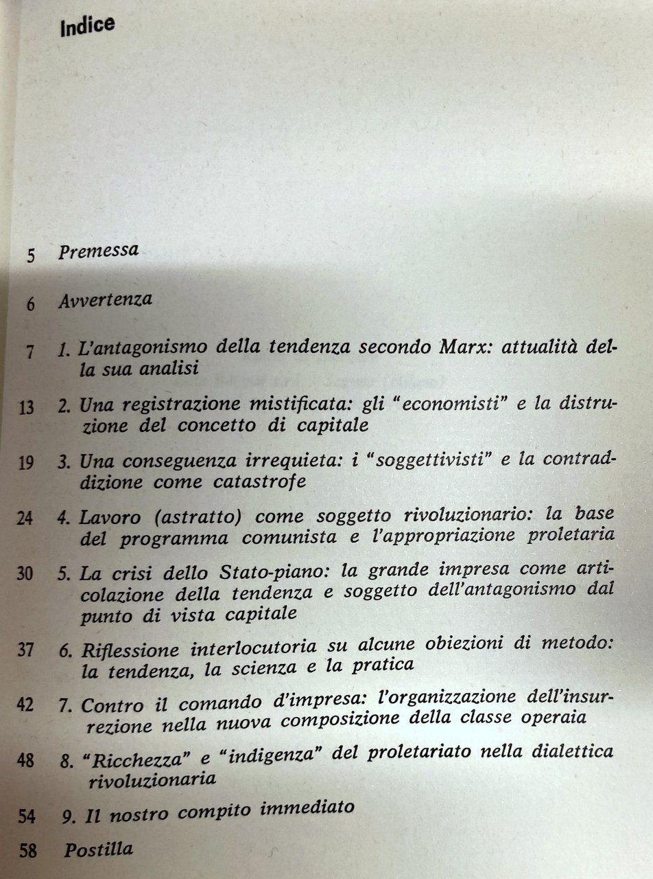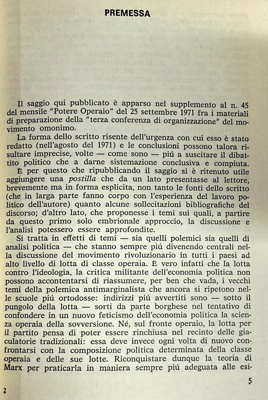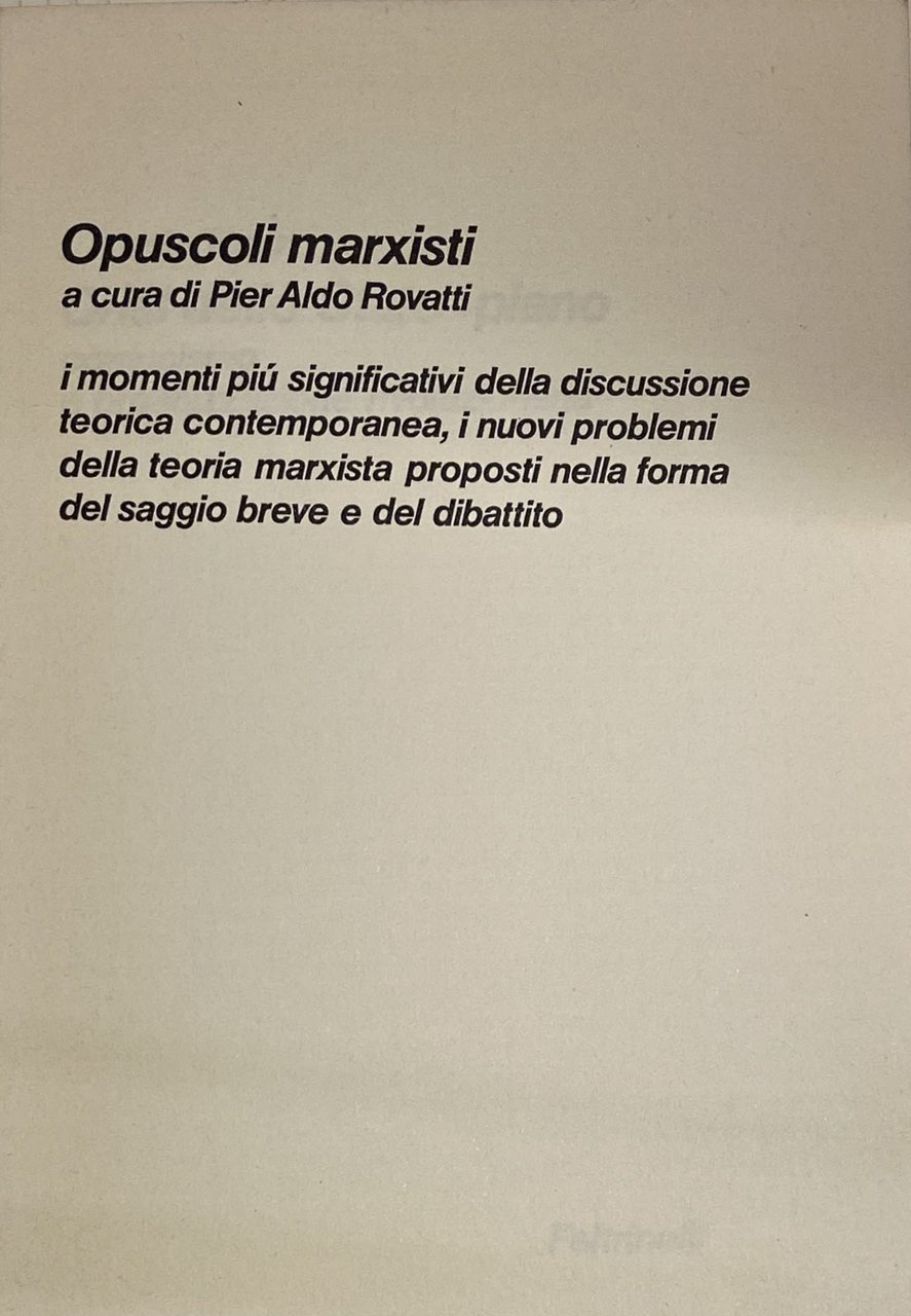Soggetti: Marxismo, Filosofia politica, Comunismo, Rivoluzione, Lotta di classe, Impero, Imperialismo, Sinistra, Ideologia, Ideologie politiche, Classici, Michael Hardt, Karl Marx, Engels, Lenin, Economia, Proletariato, Dialettica, Materialismo storico, Antagonismo, Unione Sovietica, Capitalismo, Capitale finanziario, Lavoro, Diritti sociali, Socialismo, Riformismo, Critica marxista, Borghesia, Ricchezza, Potere, Contraddizioni, Stato, Controllo, Teorie economiche, Fabbriche, Operai, Salario, Merce, Produzione, Sviluppo, Partito operaio, Proletari, Costituzione materiale, Dominio, Sabotaggio, Nemici, Anni Sessanta, Anni Settanta, Collezionismo, Riferimento, Consultazione, libri Vintage fuori catalogo, Terrorismo, Sindacalismo, Sfruttamento, Sistema sociale, Società, Classe operaia, Diritto, Pašukanis, Anarchismo, Bakunin, Sovversione, Feticismo, Alienazione, Ortodossia, Lineamenti, Quaderni filosofici, Che fare?, Mao-Tse Tung, Cina, Scritti scelti, Libertà, Odio, Proprietà, Valore, Denaro, Moneta, Debito, Surplus, Profitto, Emancipazione, Mediazione, Mistificazione, Coscienza, Tattica, Strategia, Sottosviluppo, Neomarxismo, L. Ferrari Bravo, Scuola di Cambridge, Maynard Keynes, Pietro Sraffa, Smith, Ricardo, C. Napoleoni, A. Ginzburg, M. Tronti, Massimo Cacciari, Lukacs, P. Bruckner, Capitolo IV Inedito, H.J. Krahl, Kritik, A. Sohn Rethel, Avanguardie, Terza Internazionale, Monopolio, Pier Aldo Rovatti, Saggi brevi, Testi marxisti, Marxism, Political philosophy, Communism, Revolution, Class struggle, Empire, Imperialism, Left, Ideology, Political ideologies, Classics, Economy, Proletariat, Dialectics, Historical materialism, Antagonism, Soviet Union, Capitalism, Financial capital, Work, Social rights, Socialism, Reformism, Marxist criticism, Bourgeoisie, Wealth, Power, Contradictions, State, Control, Economic theories, Factories, Workers, Salary, Goods, Production, Development, Workers' Party, Proletarians, Material Constitution, Domination, Sabotage, Enemies, The Sixties, The Seventies, Collecting, Reference, Consultation, out of print books, Terrorism, Syndicalism, Exploitation, Social system, Society, Working class, Law, Anarchism, Subversion, Fetishism, Alienation, Orthodoxy, Features, Philosophical notebooks, What to do?, Russia, China, Selected writings, Freedom, Hatred, Property, Value, Money, Currency, Debt, Profit, Emancipation, Mediation, Mystification, Conscience, Tactics, Strategy, Underdevelopment, Neomarxism, School of thought, Unpublished Chapter IV, Avant-garde, Third International, Monopoly, Short essays, Marxist texts