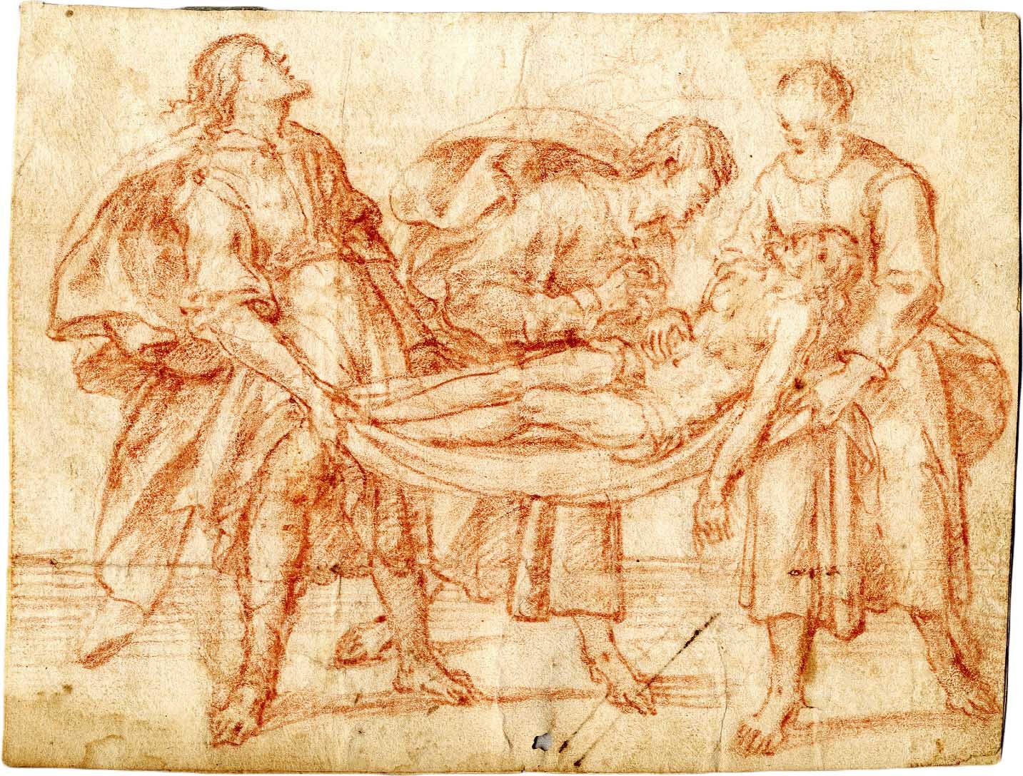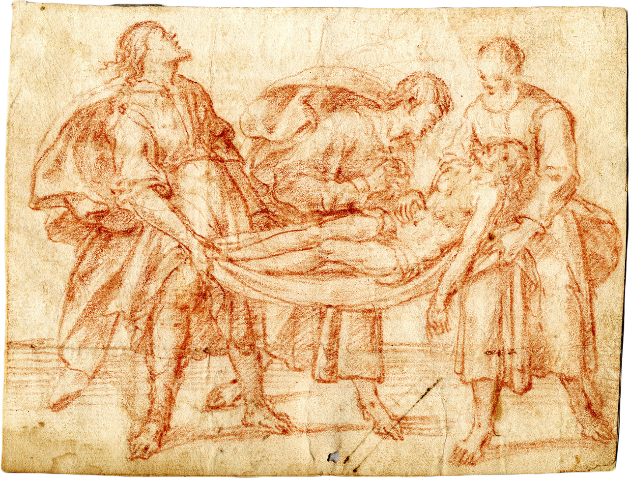 >Disegno in sanguigna (cm 13,7x17,7), su carta vergata fine in gran parte controfondata, filigrana con colomba nel cerchio (Briquet 12250) databile 1560-90. Non firmato ma attribuibile a Bernardino Barbatelli detto il Pocetti, il tratto, il tema trattato e le figure sono in analogia con quelle eseguite dal maestro. Bernardino Barbatelli detto il Pocetti (Firenze 1548 - ivi 1612). Allievo di Michele di Ridolfo Ghirlandaio e di B. Buontalenti, esordì come decoratore (facciate di palazzo Cappello e del palazzetto Pitti).