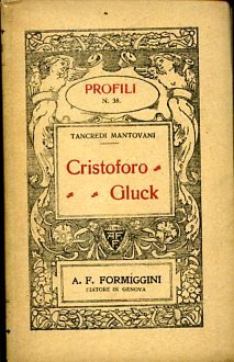 In-16°, pp. 64, (6), cartonatura editoriale pergamenata con titolo in rosso e nero entro ricca bordura xilografica istoriata da disegno di Artioli. Ritratto di Gluck in antiporta. Perfetta copia a fogli chiusi. Prima edizione. 'Nei primi anni di attività [Formiggini] diede vita anche a due collane che avrebbero, fino alla fine, caratterizzato più delle altre la sua produzione editoriale: i 'Profili', nei quali apparvero dal 1909 al 1938 ben 189 titoli, e i 'Classici del ridere', con 105 titoli dal 1913 al 1938. Nel 1909 era uscito il primo volume dei 'Profili' dedicato al Botticelli e steso da I. B. Supino. Fino alla guerra se ne stamparono circa 6 o 7 ogni anno; la collana andò poi avanti in tono minore con 2 o 3 numeri ogni anno fin verso il 1922, quando sembrò ritornare a nuova vita, prima di riadagiarsi sui 2 o 3 numeri annuali. Con questa collana, che certamente conobbe il favore del pubblico, il Formiggini voleva da una parte avvicinarsi ai non addetti ai lavori, dall'altra desiderava accontentare quanti, con una spesa contenuta, amavano possedere 'graziosi volumetti ben rilegati in pergamena-papirus ed adorni di illustrazioni e di fregi originali' (Trent'anni dopo, p. 10); gli studenti e quanti fossero interessati ad ulteriori approfondimenti avrebbero trovato in appendice una buona messe di informazioni bibliografiche.' (Giorgio Montecchi in D.B.I., XLIX, 1997). Profili, n. 38.