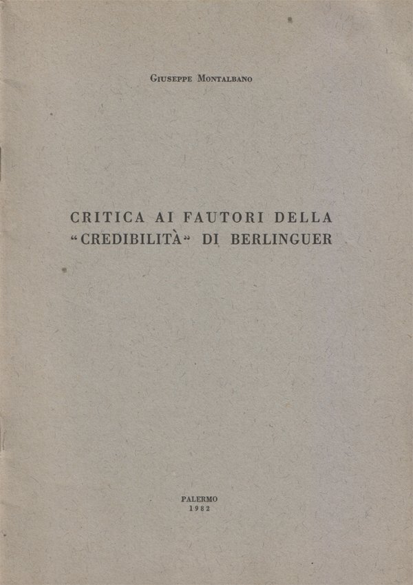 In-8°, pp. 27, (1), copertina editoriale. Alle pagine 2 e 4, lunga dedica autografa, firmata "Peppino", datata 2/3/1982. In ottimo stato. Sommario. I) Cenni introduttivi; II) Critica ai fautori della "credibilità" di Berlinguer, circa la diversità di filosofia e metodo in Marx; III) Critica ai fautori della "credibilità" di Berlinguer circa il "riformismo" del Partito Comunista Italiano; IV) Critica ai fautori della "credibilità" di Berlinguer, circa la conciliabilità fra Cristo e Marx; Conclusione.