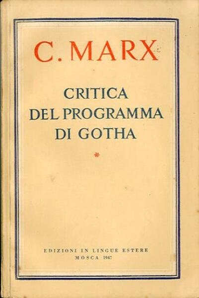 61 p. ; 20 x 13 cm. La «Critica del Programma di Gotha» è un documento basato su una lettera di Karl Marx scritta nel maggio del 1875 alla fazione Eisenach del movimento socialdemocratico della Germania, con cui Marx e Friedrich Engels erano in stretto contatto. In tale saggio Marx rivolge una critica al piano d'azione proposto dal partito operaio tedesco per il programma di Gotha. Le principali critiche di Marx al programma sono principalmente rivolte alle posizioni lassalliane dello stesso. Si tratta inoltre dell'unico testo in cui Marx cita la dittatura del proletariato come primo periodo della rivoluzione, dittatoriale per la necessità di difendere quest'ultima. Nello stesso, tra le altre cose, criticava la tendenza a considerare i lavoratori solamente come "tali", tutti uguali, senza considerare le loro diversità in quanto individui ed esseri umani. A questo proposito vi è nel testo una critica ad un articolo del programma che vorrebbe retribuire i lavoratori nell'ambito di uno stato socialista secondo ciò che essi producono, ovvero secondo parametri capitalistici, mentre Marx sostiene che a ognuno si debba dare "secondo il suo bisogno". Brossura editoriale, coperta in cartoncino flessibile con titolo impresso al piatto, muto il dorso. Sottolineature a matita, per il resto libro integro. Codice libreria 6459.