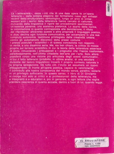 La letterarietà, ossia ciò che di una data opera fa un'opera letteraria: dalla lontana stagione del formalismo russo agli sviluppi recenti dello strutturalismo semiologico, lungo un arco di ormai sessant'anni i teorici della letteratura hanno cercato di catturare, mutuando dalla linguistica il rigore dei procedimenti sperimentali, un'essenza perenne, una sostanza platonica. Lo scarto dalla norma, la connotazione in quanto contrapposta alla denotazione, il rifiuto del riferimento: attraverso queste e altre proprietà il linguaggio poetico, si dice, declina ogni funzione comunicativa, per accamparsi in una sua compiuta autonomia, testimone privilegiato della creatività umana contro gli automatismi discorsivi della prassi comune.