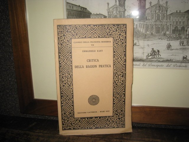 In-8°, pp. 205, brossura editoriale con titolo entro bordura ornamentale impressa in bianco su fondo nero. Settima edizione. Ottimo. Intonso Traduzione italiana di Francesco Capra della seconda critica kantiana, la 'Kritik der praktischen Vernunft' (1788), una delle opere capitali della storia della filosofia, punto d'avvio della moderna riflessione sui temi della morale.Classici della filosofia moderna, IX.