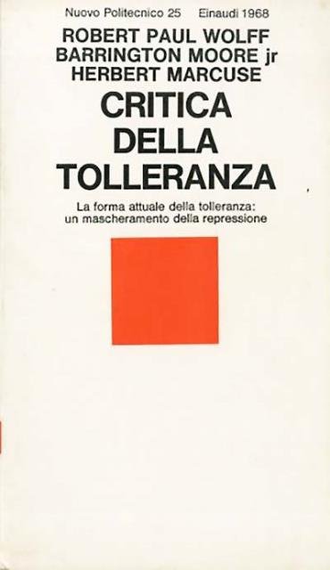 105 p. ; 18 x 11 cm. Nuovo politecnico, 25. Il titolo del lavoro (la cui traduzione letterale è «Critica della tolleranza pura») è ispirato al celebre scritto kantiano Critica della ragion pura. Il volume, infatti, contiene alcune idee non estranee al filosofo tedesco; tuttavia l'intenzione degli autori non è quella di limitare il proprio giudizio al soggetto trascendentale (tolleranza pura), bensì essi estendono la critica alla tolleranza pratica, ovvero al soggetto empirico. L'opera è composta da tre saggi: «Al di là della tolleranza» di Robert Paul Wolff; «Tolleranza e scienza» di Barrington Moore jr.; «La tolleranza repressiva» di Herbert Marcuse. Titolo originale dell'opera: «A critique of pure tolerance». Traduzione di Domenico Settembrini e di Lorenzo Codelli. Brossura editoriale, coperta in cartoncino flessibile plastificato a colori b/n e rosso. Codice libreria 9135.
