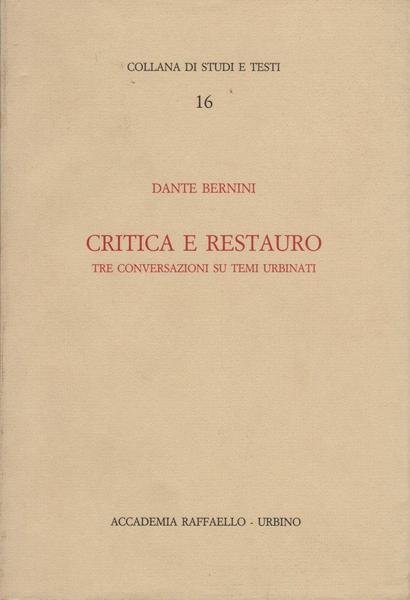 .Ho raccolto qui i testi delle tre conversazioni urbinati e la premessa generale al corso di restauro e ringrazio vivamente l'Accademia Raffaello e il suo presidente per avermi offerto l'opportunità di pubblicare sotto il titolo unico di "Critica e Restauro" quei materiale che, integrato da note di aggiornamento, mi pare rivestano ancora un qualche interesse. (T-CA)