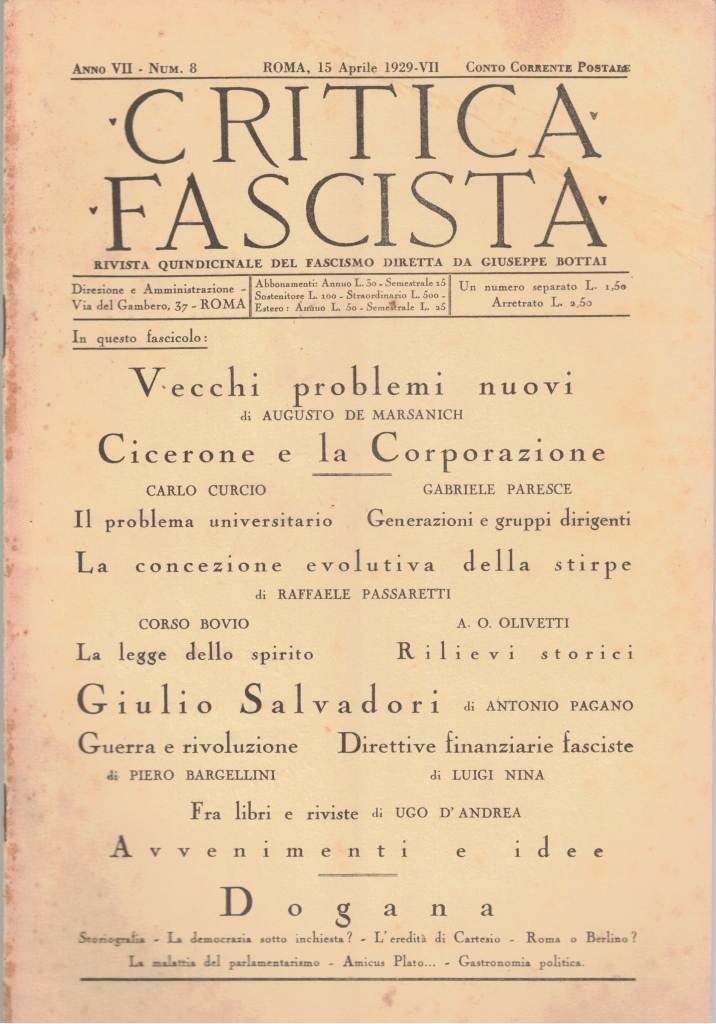 Critica fascista. Rivista quindicinnale del Fascismo, diretta da Giuseppe Bottai, Roma, anno VII, 1929, 11 numeri non consecutivi, pp. 20 circa cad. per un totale di pp. 224 (64), cm 31, fascicoli rilegati a punto metallico. Il lotto comprende i seguenti undici numeri di Critica Fascista: a. VII, n. 8, 15 aprile 1929, pp. 145-168 – a. VII, n. 12, 15 giugno 1928, pp. 229-248 (4) – a. VII, n. 14, 15 luglio 1929, pp. 269-288 (4) – a. VII, n. 15, 1 agosto 1929, pp. 289-308 (4) – a. VII, n. 16, 15 agosto 1929, pp. 309-328 (8) – a. VII, n. 17, 1 settembre 1929, pp. 329-348 (8) – a. VII, n. 18, 15 settembre 1929, pp. 349-368 (4)– a. VII, n. 19, 1 ottobre 1929, pp. 369-388 (8) – a. VII, n. 20, 15 ottobre 1929, pp. 389-408 (8) – a. VII, n. 22, 15 novembre 1929, pp. 429-448 (8) – a. VII, n. 23, 1 dicembre 1929, pp. 449-468 (8). Indici: A. VII, n. 8: A. De Marsanich, Vecchi problemi nuovi – Critica fascista, Cicerone e la Corporazione – C. Curcio, Il problema universitario – G. Paresce, Generazioni e gruppi dirigenti – R. Passaretti, La concezione evolutiva della stirpe – C. Bovio, La legge dello spirito – A. O. Olivetti, Rilievi storici – A. Pagano, Giulio Salvadori – P. Bargellini, Guerra e rivoluzione – L. Nina, Direttive finanziare fasciste – A. Nasti, Avvenimenti e idee – U. D’Andrea, Fra libri e riviste – Dogana (Storiografia – La democrazia sotto inchiesta? – L’eredità di Cartesio – Roma o Berlino? – La malattia del parlamentarismo – Amicus Plato… - Gastronomia politica) – Festa in famiglia – L’Italia letteraria – Precursori. A. VII, n. 12: Critica Fascista, Azione corporativa e cultura – C. Curcio, Mussolini e la stabilizzazione della pace europea – S. M. Cutelli, Il problema dei giovani – La circolazione dei migliori nello Stato Fascista – L. Chiarini, Coscienza imperiale – E. Anagnine, W. Goethe nel libro di un italiano – R. Pavese, Filosofia e fascismo – P. Benassi, L’aumento del dazio sul grano e il dovere degli agricoltori – E. D’Albergo, L’antiurbanesimo- U. D’Andrea, Fra libri e riviste – Dogana (L’immortale Proudhomme – Cultura sul serio – Morte al règisseur – Saluto al Bargello) – Opinioni sull’Europa – Le bombe a Tunisi – Il liberalismo come utopia. A. VII, n. 14: G. Casini, Perché tramonta la lotta di classe – M. Govi, Filosofia, religione e antifascismo – C. Bovio, La psicologia della Rivoluzione – R. Ricci, L’arte di leggere - L. Chiarini, Versaglia – E. Colombi, Movimento corporativo nella Svizzera – A. Nasti, Avvenimenti e idee – P. Benassi, Produrre a prezzodi concorrenza – U. D’Andrea, Fra libri e riviste – Dogana (Apologo sindacale – Ford rimbambisce. Ed Edison lo segue – Variazioni wagneriane – Il giuoco delle parti – Incoscienza o disprezzo? – Shakespeare e lo sciopero – Chesterton, il leone e i discorsi) – Crisi dell’autorità o del parlamentarismo? – Voce d’oltre tomba – Il cavolo a merenda – L’eredità di Rousseau – Keyserling e il fascismo. A. VII, n. 15: Critica Fascista, Dal Comitato Intersindacale al Comitato delle Corporazioni – B. Crespi, Contrasti – L. Giusso, Giorgio Sorel e il terzo stato francese – G. Farina D’Anfiano, La rivelazione e il pensiero moderno – O. C. Spada di Alfedena, L’Italia e la costruzione dell’Impero coloniale – E. Colombi, Come la Germania si arrende dinanzi all’invasione del capitale straniero – B. Brunello, Stato etico e stato politico – L. Nina, I bilanci dei Comuni – A. Nasti, Avvenimenti e idee – U. D’Andrea, Fra libri e riviste – Dogana (Studenti di Pisa – Il vero male di Poincaré – Coerenza – Relativismo – Buon senso britannico – Occhio alla città) – La pesca reale. A. VII, n. 16: Critica Fascista, Il Partito e l’ordinamento corporativo – G. Paresce, Funzione e coscienza della classe dirigente – D. Montalto, La libertà e i giovani – R. Caniglia, Bandiere sul Reno – D. Rende, Libertà ed autorità – A. Messina, Psicosi catastrofica – R. Pavese, Fascismo e filosofia – A. Nasti, Avvenimenti e idee – E. Cione, Il ritorno di Faust – Dogana (Rose rosse ginevrine – Surtout pas tro de zèle – Lo stato genitore – Carattere della moderna letteratura – La guerra da Capri) – Notizia del Kairos – Il dilettante cadavere – Vient de paraitre – Accidenti alla letteratura. A. VII, n. 17: Critica Fascista, Tempo di un problema – Dei fiduciari senza fiducia, ovvero: degli sfiduciari – C. Pellizzi, Aprire le finestre! – S. M. Cutelli, Selezione, autorità e libertà – L. Ingianni, I giovani nella Rivoluzione fascista – L. Nina, Spese pubbliche – E. Colombi, Il nuovo periodo del nazionalismo ebreo – I due congressi israeliti di Zurigo – E. Rocca, Tappe del romanzo tedesco e letteratura italiana – G. Bronzini, Il Fascismo e la difesa dell’Europa – A. Nasti, Avvenimenti e idee – Dogana (Ritorni filisteici – Nulla o tutto? – Dante precursore di Pan-Europa – Uomo-motore – Le ragioni di Bontempelli – Snowden – Rettificare s. v.p.) – Uno che fa l’indiano – I bastardi del bolscevismo – La capitale delle nazioni. A. VII, n. 18: Critica Fascista, Il cammino segnato – B. Crespi, Cosa insegna l’America – E. Colombi, Arabi ed ebrei – U. Nani, Paneuropa – G. Napolitano, L’economia corporativa esiste – R. Passaretti, Dal romanticismo alla tecnica del sindacalismo fascista – A. O. Olivetti, Una crisi di dissolvimento – G. De Luca, Panorama spirituale del Belgio – A. Nasti, Avvenimenti e idee – Dogana (Dell’esser seri – E capiteci! Se potete – Proposta per un catenaccio alla cultura – Il giuoco dell’Europa – melafumo, o rivendicazione dei quarantenni) – Polemica chiusa – Lo Stato, la morale e il prof. Letur – Chi si rivede: Miglioli! – Appunti per il terzo tempo. A. VII, n. 19: A. Nasti, Confronto di generazioni – G. Contri, Astrazioni e relatà