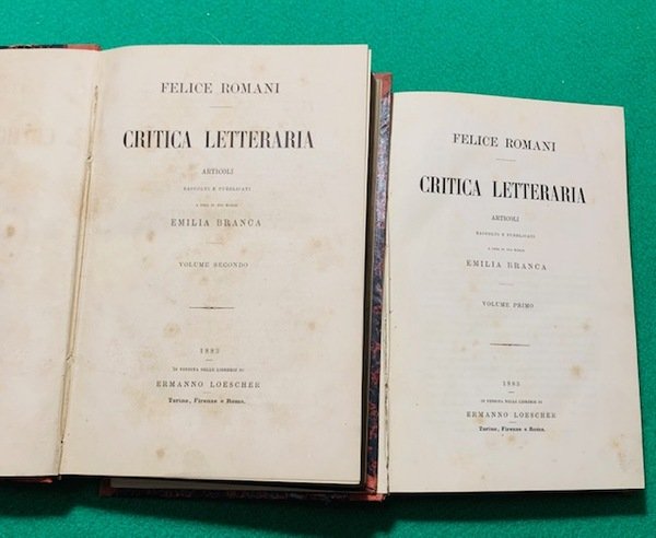 In 8°; due tomi: XVI, 514, (2) pp. e (4), 556 pp. Legature coeve in mezza-tela rossa con piatti foderati con carta marmorizzata rossa. Prima edizione, pubblicata postuma, di questa critica letteraria del celebre librettista, poeta e critico musicale italiano, fra gli autori più noti del suo tempo, Felice Romani (Genova, 31 gennaio 1788 - Moneglia, 28 gennaio 1865). Fu tra i massimi librettisti dell'ottocento e a lui si devono più di 100 libretti d'opera per autori quali Vincenzo Bellini, Gaetano Donizetti, Saverio Mercadante, Giacomo Meyerbeer, Giovanni Paci ma anche Verdi e Rossini. Qualche leggera brunitura ai frontespizi a causa della qualità della carta utilizzata e per il resto, nel complesso esemplare in buone-ottime condizioni di conservazione.