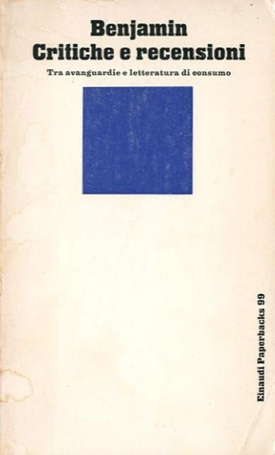 VIII, 364 p. ; 21 x 13 cm. Einaudi Paperbacks. Questa scelta di critiche e recensioni di Benjamin giustifica la sua pretesa, espressa in una lettera del 1930, "di essere considerato il primo critico della letteratura tedesca". Compl. del titolo in copertina "Tra avanguardie e letteratura di consumo". Titolo originale dell'opera: "Gesammelte Schriften". Traduzione di Anna Marietti Solmi. Brossura editoriale, coperta in cartoncino flessibile plastificato opaco a colori (b/n e blu). La coperta presenta alcuni segni del tempo (leggero ingiallimento), interno in buono stato. Codice libreria 3431.