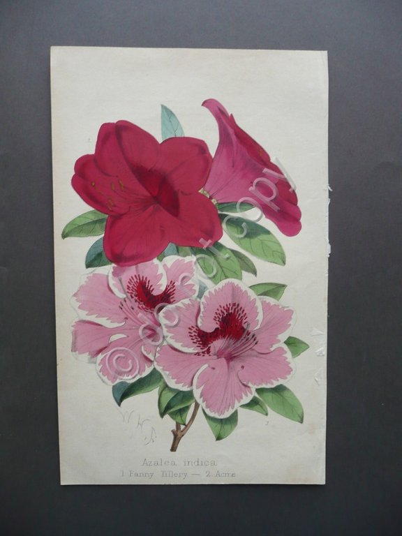 Cromolitografia, Azalea Indica 1. Fanny Tillery 2. Acme J.L.Macfarlane Del., s.d. (primo Novecento circa), bella cromolitografia floreale su carta, cm 23,5x14,5. Condizioni di conservazione Esemplare in buone condizioni con leggere tracce d'uso, margini leggermente rifilati, angoli con minimi difetti, un margine est. con lievi tracce di precedente inserimento entro volume. SC03.D9722 N