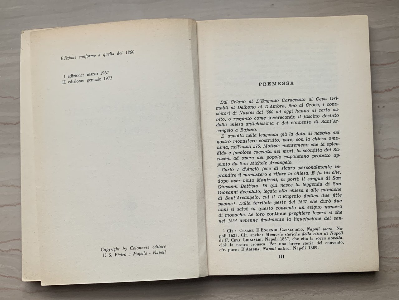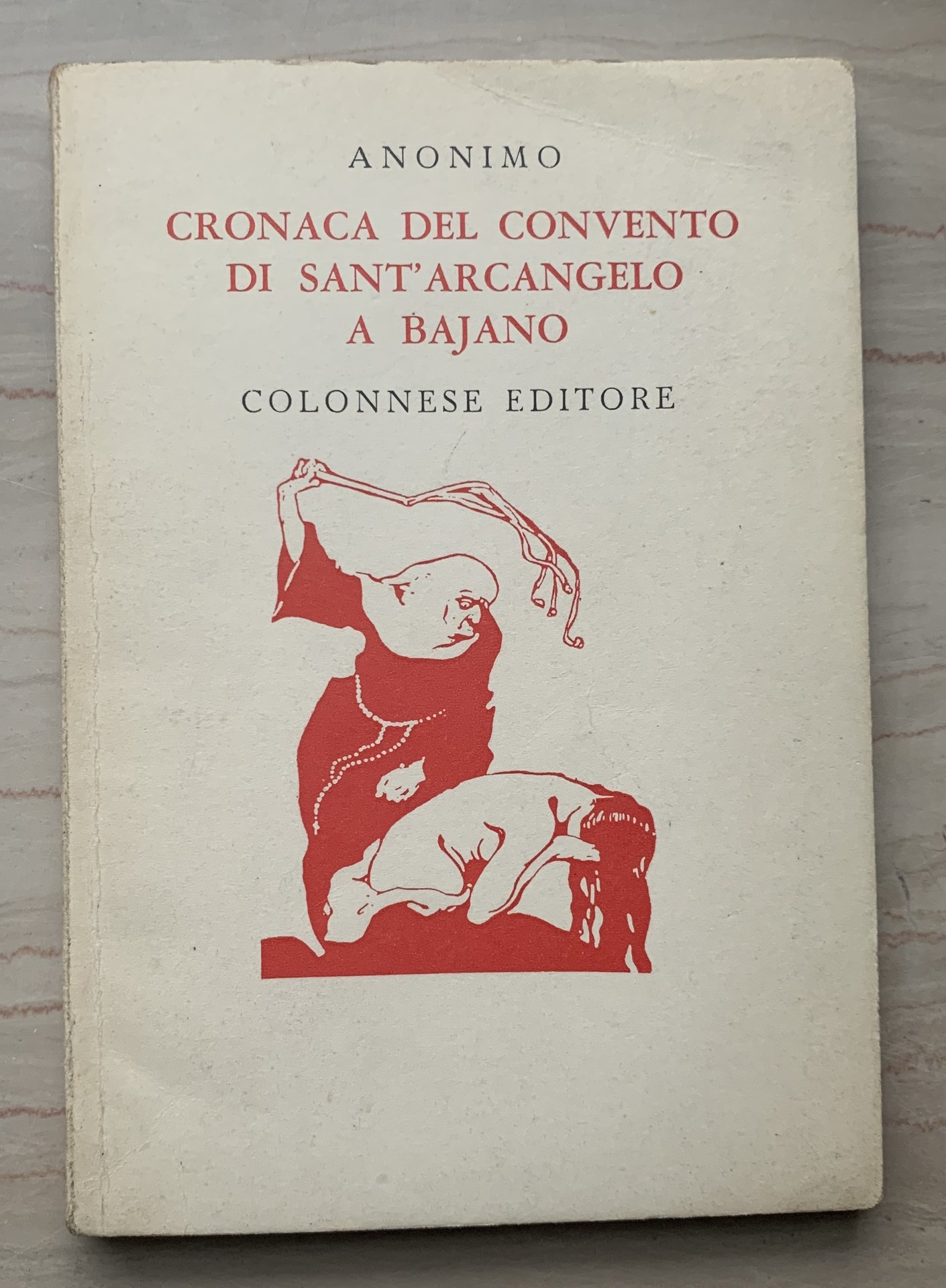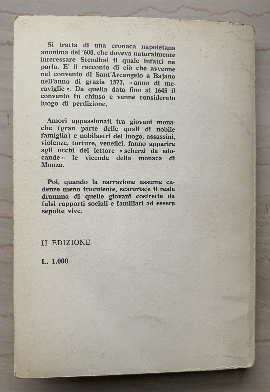 II ed. Colonnese editore conforme a quella del 1860: 31 gennaio 1973 (ed. originale: Cronaca del convento di sant'Arcangelo a Bajano estratta dagli Archivj di Napoli, Italia 1860 - I ed. Colonnese editore: marzo 1967). XVI/X+118=128/brossura in cartoncino liscio avorio con grafica in nero e rosso. Stato buono (lieve usura della copertina ai margini - copertina e pagine leggermente brunite).
