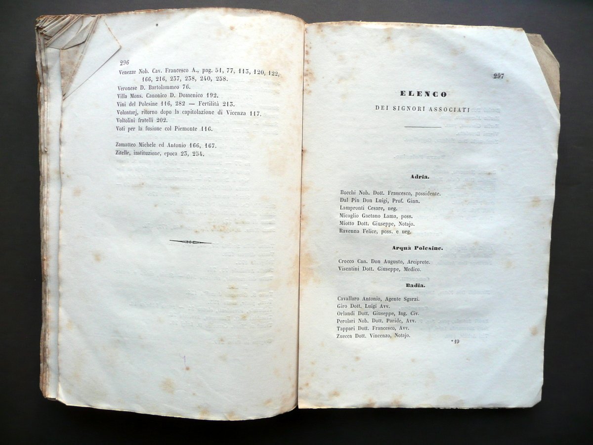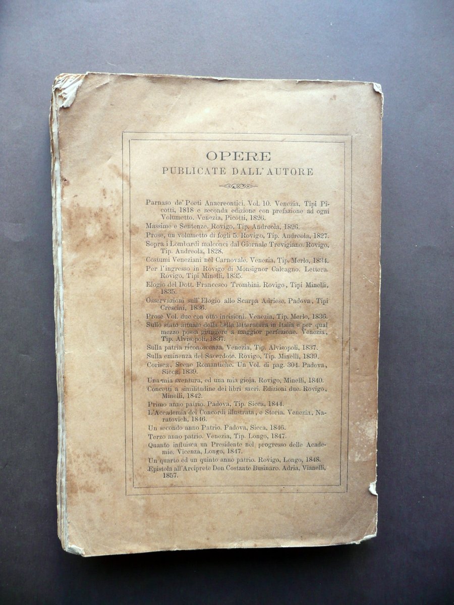 Nicolò Biscaccia, Cronache di Rovigo Dal 1844 a tutto il 1864 Premessa una succinta istoria sulla origine dell'antico Rhodigium di Nicolò Biscaccia Socio dell' I. R. Accademia di Padova e degli Atenei di Treviso e Bassano Prem. Stab. di P. Prosperini, Padova 1865, cm 22,5x15, pp. 306; brossura ed. ill. in b/n. Dorso con applicato parziale ex libris (vedi foto). Condizioni di conservazione Esemplare in discrete condizioni con tracce d'uso e alcune leggere bruniture; brossure con qualche minimo strappetto e mancanza ai margini e agli angoli; angoli della brossura ant. e di alcune pagine con una piccola pieghetta; dorso con segni di utilizzo, qualche piccola mancanza e strappetto principalmente alle cuffie; parte sup. della brossura ant., della prima bianca, del frontespizio e della dedicatoria con una leggera ombra di gora che non compromette la lettura del testo (vedi foto); qualche pagina con piccoli leggeri segnetti e sottolineature a matita. Prima bianca con vecchie note numeriche a pastello blu. Molto rara edizione originale. SETT126.L12346 N