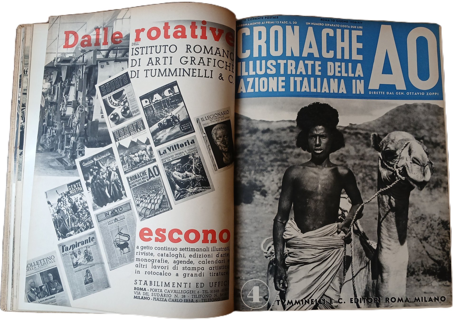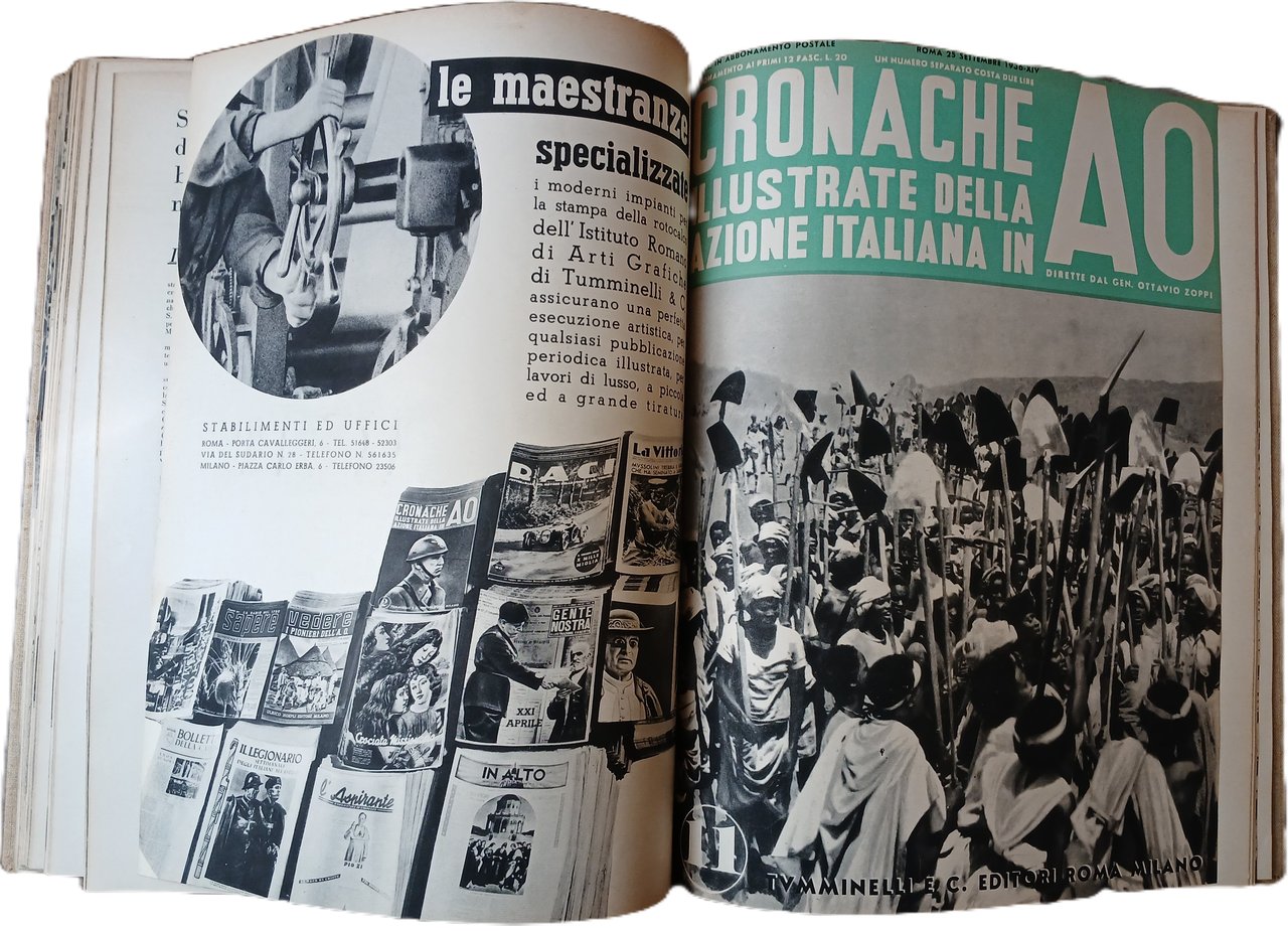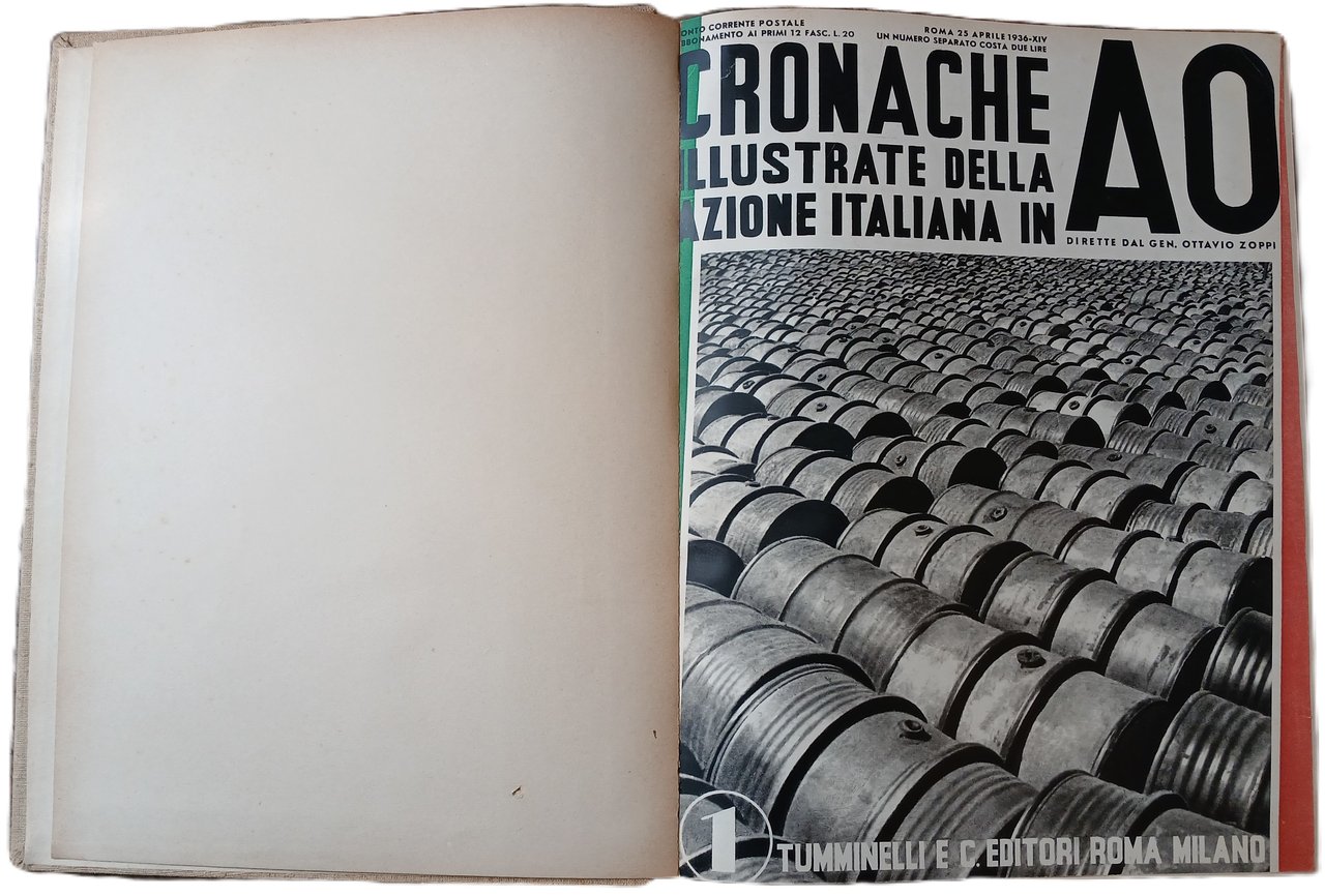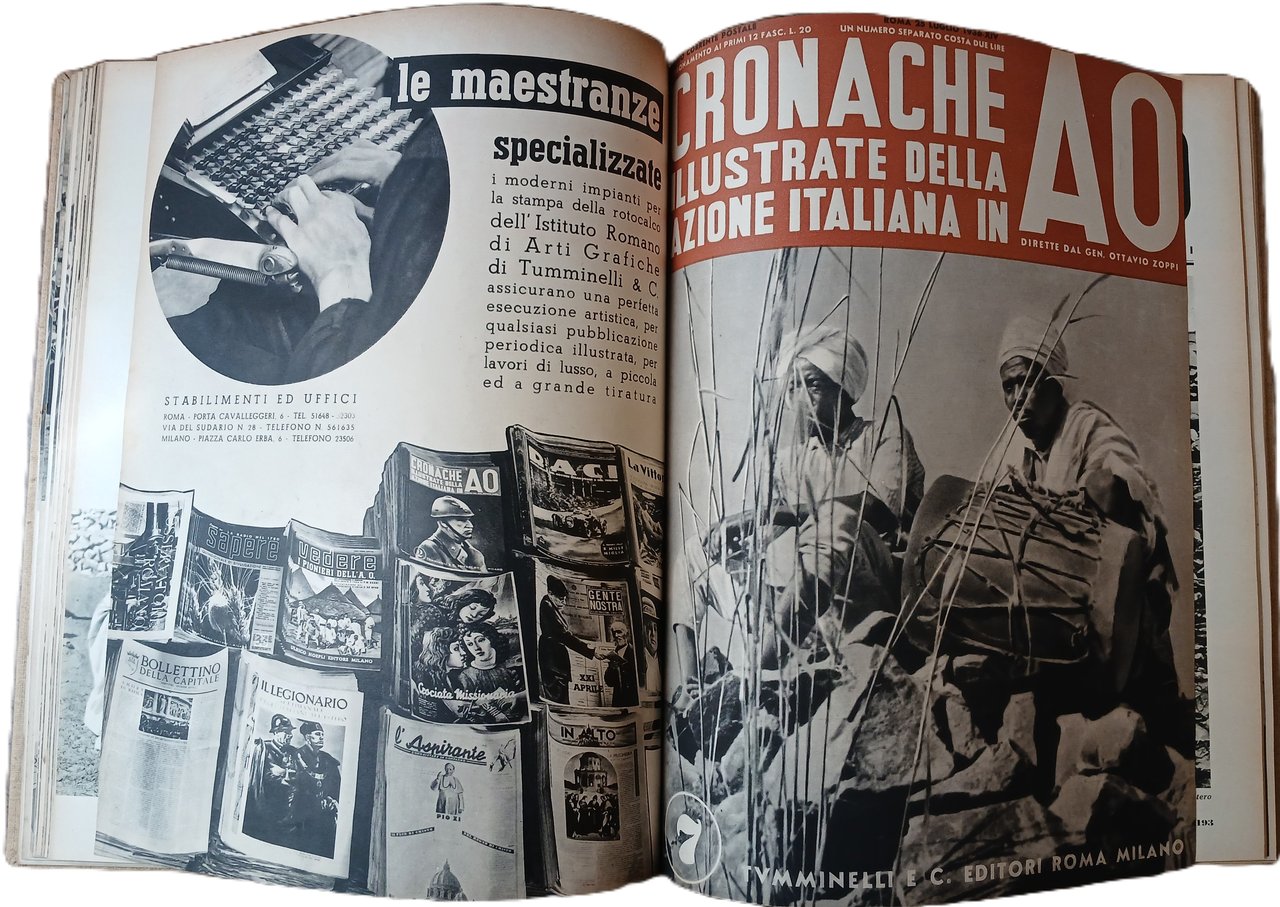 - Dodici numeri, tutto il pubblicato, del quindicinale "Cronache illustrate della azione italiana in A. O." diretto dal generale Ottavio Zoppi, stampati dal 25 aprile al 10 ottobre 1936 e riuniti in un solo tomo
