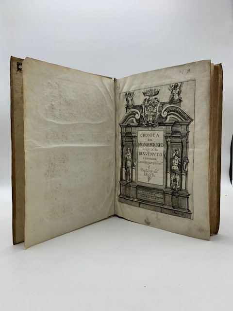 In 4 (cm 21,5 x 30), pp. (32) + 418 + (2). Frontespizio inciso all'acquaforte con titolo entro cornice architettonica. Legatura coeva in piena pergamena. Rara edizione originale in lingua italiana di questa storia del Monferrato, la piu' importante cronaca insieme a quella di Galeotto del Carretto. L'Autore e' Benvenuto Sangiorgio, conte di Biandrate, Cavaliere Gerosolimitano, giureconsulto. Nacque a Casale nel 1450 e mori' nel 1527. "La cronica latina del San Giorgio, la quale altro non e' che un brevissimo compendio dell'italiana, fa stampata in Asti nel 1519 ed in Trino nel 1521 ma ambedue queste edizioni sono rarissime. Sono sottili le indagini del barone Vernazza per determinare il tempo in cui il San Giorgio scrisse la sua cronica, e fondatissime le ragioni per cui s'indusse a credere che, sebbene egli vi abbia dato principio negli ultimi anni del secolo XV, pure continuo' ad occuparsi della medesima fatica negli anni che vennero dopo; e a dichiarare in conseguenza che il San Giorgio puo' essere annoverato tra gli storici del secolo XVI. Una tal cronaca non e' opera, come si suol dire, di getto; essa ricercava nell'autore piuttosto diligenza che ingegno ed, eletta una volta la forma in cui volea compilarla, l'unico studio stava nel collocare al loro debito sito le notizie e i documenti a misura che gli venivano alle mani." (L. Suali d'Igliano, "Sulla condizione degli studi nella monarchia de Savoia", 1845, p. 122. Lozzi, 2868. Manno, X, 39215. Platneriana, 213. Fossati-Bellani, 1842. Brunet, VI, 25321. Capponi, p. 340. Picchetto, n. 97. Manca a Coleti, alla Choix dell'Olschki, alla Vinciana e a Graesse.
