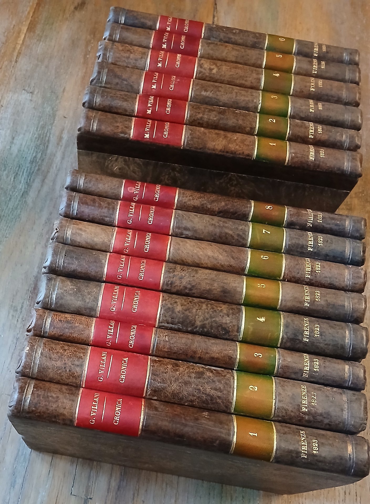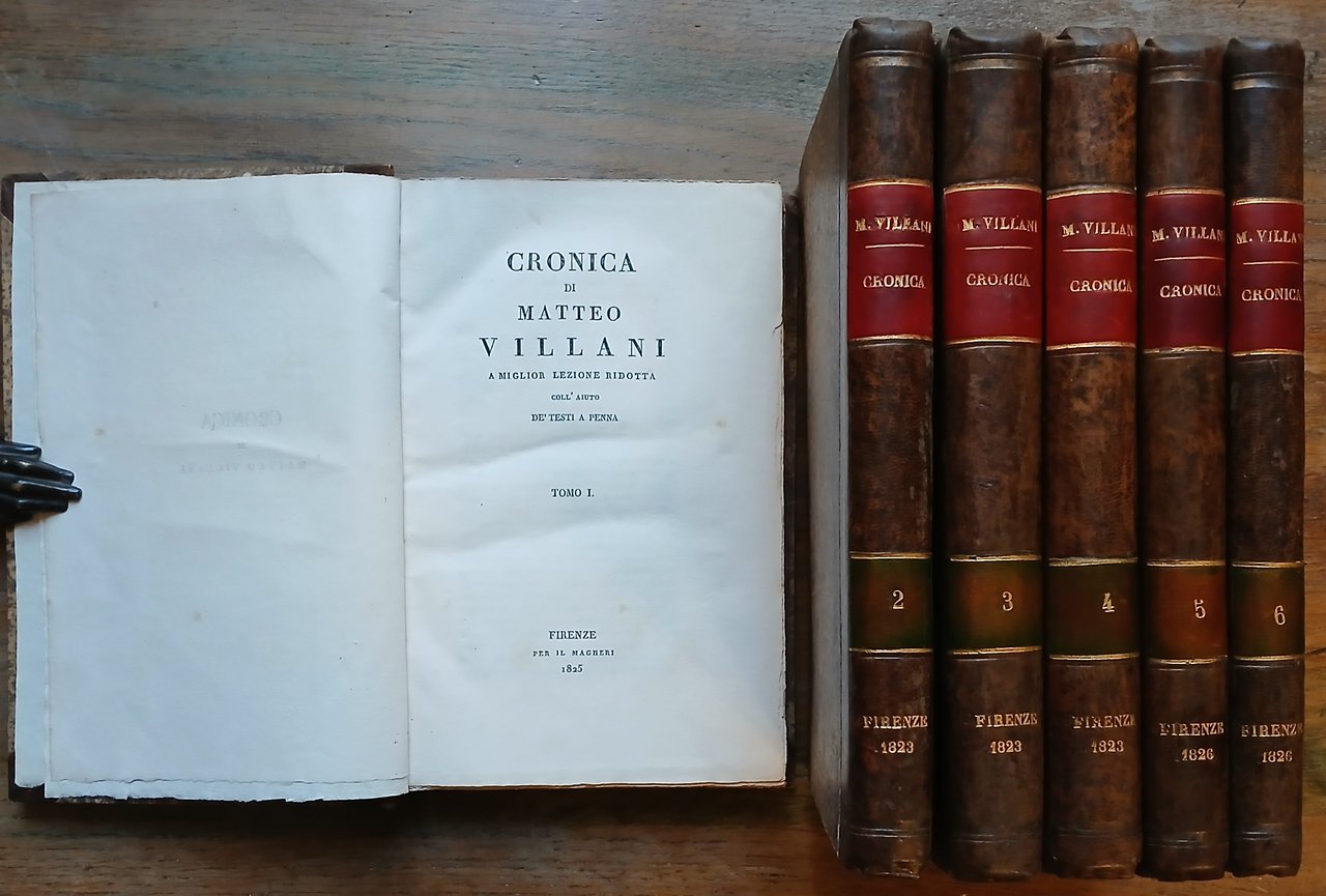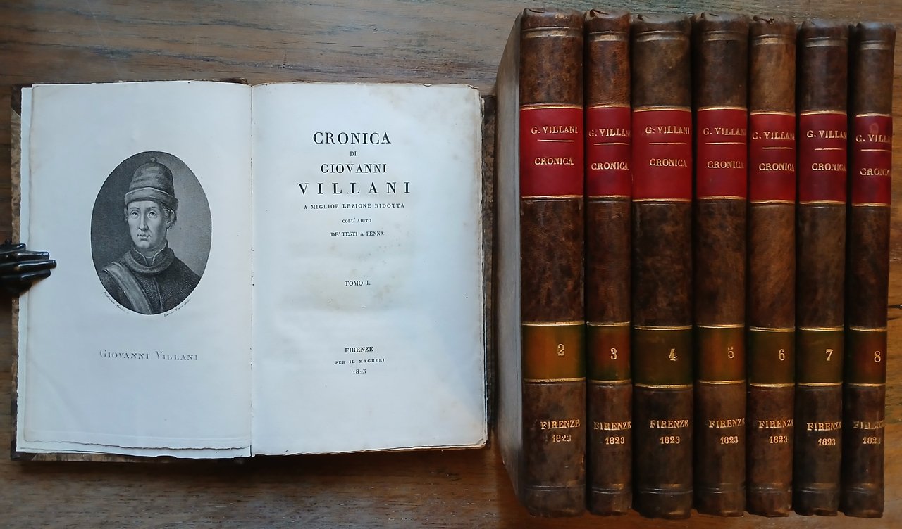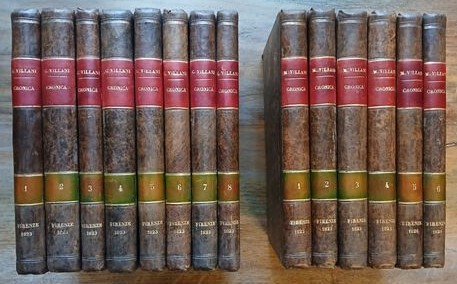 Quattordici volumi in 8°, legatura coeva in mezza pelle ocra scuro, dorsi lisci con luogo e data di edizione impressi in oro, doppio tassello in pelle rossa e verde con numerazione e titoli dorati, carta marmorizzata monocroma ai piatti. I primi otto tomi, stampati nel 1823, contengono la "Cronica di Giovanni Villani" : pp. XXVIII,318,(2), con in antiporta un ritratto dell'autore disegnato da Ferdinando Moutier ed inciso da Lavinio Figlio ; 406,(2) ; 222,(2) ; 372,(2) ; 312 ; 285,(3) ; 288 ; CXXXVIII,130, nel volume ottavo sono compresi l'"Elogio di Giovanni Villani" scritto da Pietro Massai, due Indici e documenti editi ed inediti a corredo dell'opera. I successivi sei tomi, stampati dal 1825 al 1826 con numerazione propria, contengono la "Cronica di Matteo Villani" : pp. XIV,305,(1) ; 300 ; 355,(1) ; 348 ; 319,(1) ; XXIII,(1),241,(1), il volume sesto è una ristampa delle "Vite d'uomini illustri fiorentini" scritte da Filippo Villani colle annotazioni del conte Giammaria Mazzuchelli e pubblicate a Venezia da Pasquali nel 1747. Rare ed ininfluenti tracce di ossidazione, volumi solidi ed in ottimo stato di conservazione. Gamba, 1033-1034.