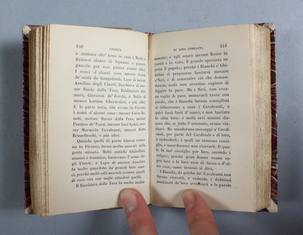 In-24°; XXXII, 431 pp. (errore di impaginazione nell'indice finale). Legatura dell'epoca in mezza pergamena, tassello in marocchino con titolo in oro al dorso, fregi in oro. Buon esemplare.
