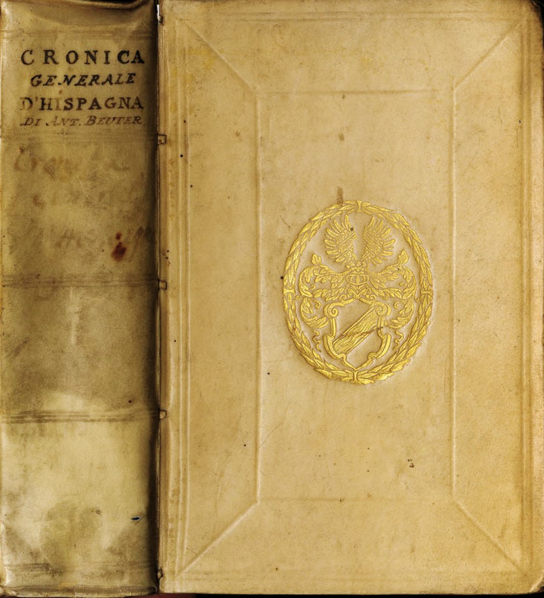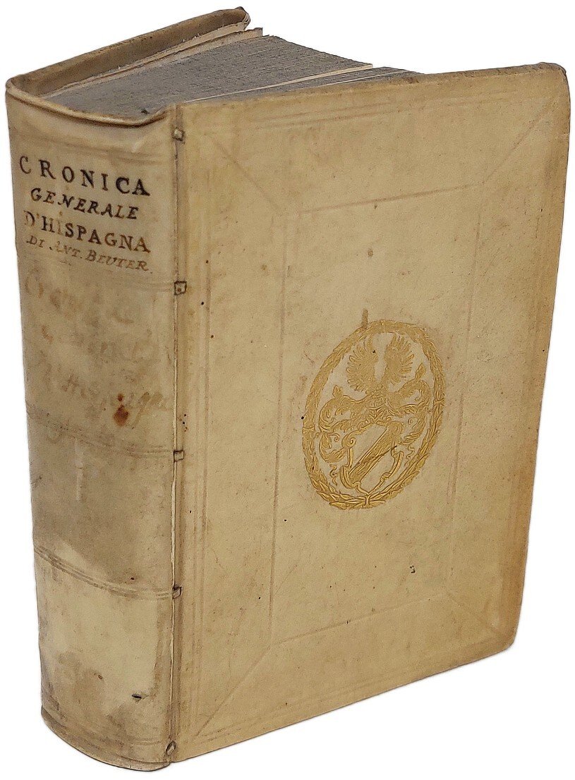 >in-8, pp.(72), 533, (3), caratt. corsivo. Bella leg. coeva p.pergamena rigida, arma nobiliare impressa in oro al centro dei piatti, titolo ms. al dorso. Impresa dei Giolito al titolo e in fine, iniziali istoriate. Le bibliografie danno una carta geografica nei fogli preliminari di alcuni esemplari, qui non presente. Vasta storia di Spagna dalle origini al XVI secolo. L'edizione originale spagnola apparve nel 1538 (prima parte) e nel 1551 (seconda parte). Buon esemplare (un lieve difetto nel margine esterno degli ultimi sei fogli). Bongi, Annali, I, 498. Palau, II, 208. Nuovo-Coppens, I Giolito, p. 208.