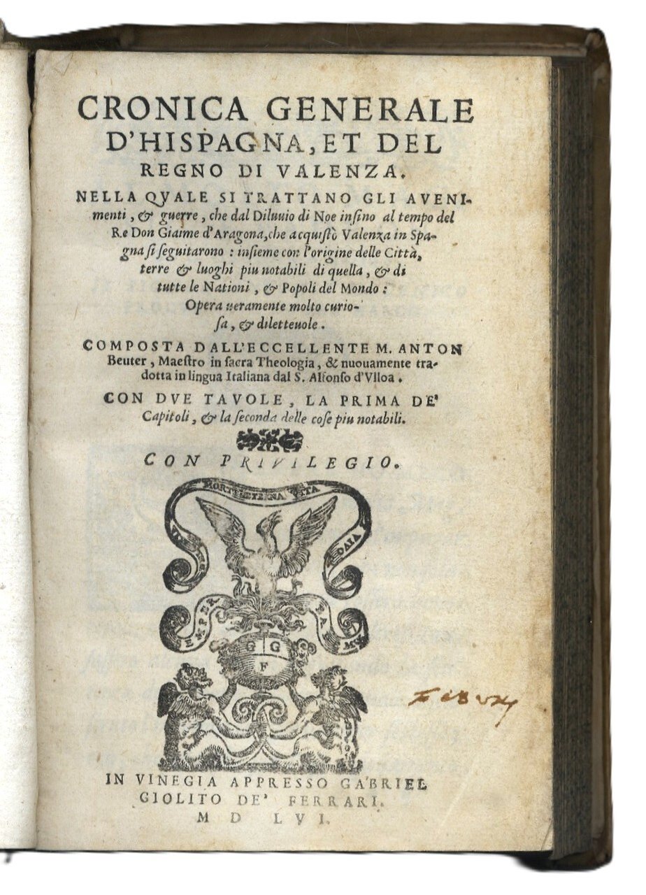 Cronica General d'Hispagna, et del Regno di Valenza... gli avvenimenti & guerre, che dal Diluvio di Noe infino al tempo del Re don Giaime d'Aragona, che acquistò Valenza...tradotta in lingua italiana