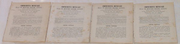 In 8. Dim. 21x15 cm. Pp. da 17 a 32; da 49 a 64; da 65 a 80; da 161 a 176. Interessante raccolta di quattro fascicoli mensili del Febbraio e maggio 1878, Aprile 1875 e Novembre 1877 che forniva le notizie aggiornate di scienze naturali ed archeologia. L'articolo di archeologia sono dedicati alla Chiesa di S. Pastore presso S. Clemente; scavi fuori Porta Portese; lucerne cristiane; scavi del Palatino; iscrizioni della via Latina; scavi di Tor Marancia.<BR>Nella parte dedicata alle scienze naturali diversi articoli: esperimenti, distanza dei satelliti; torrefazione del caffè; togliere le macchie di olio dalle incisionio in rame; rimedio per il mal di fegato, nuovo sistema di luce elettrica; telescopio di Parigi; nuovo pianeta; meteorologia; assenzio nei granari Le pagine da 167 a 170 del fascicolo di Novembre sono mancanti. Qualche figura nel testo. Copertina morbida in buone condizioni generali con usure al margine sinistro; segni manoscritti. Legatura in buone condizioni. All'interno le pagine si presentano in buone condizioni con fioriture sparse. Interesting collection of four numbers of this monthly review that gave information of natural sciences and archeology of the February and March 1878, April 1875, November 1877 The article of archeology is dedicated to the Church of S. Pastore near S. Clemente; excavations outside Porta Portese; cristian lamps; excavations of Palatino; ionscriptions in the Latina streets; excavations of Tor Marancia. In the part dedicated to natural sciences there are different articles: experiments, distance of satellites; torrefation of coffee; removing of oil stains from copper engravings; new system of electric light; telescope of Paris; new planet; meteorology. Soft cover in good general conditions with wearings in the left edges; manuscripted signs. Binding in good conditions. Inside pages are in good conditions with foxings.