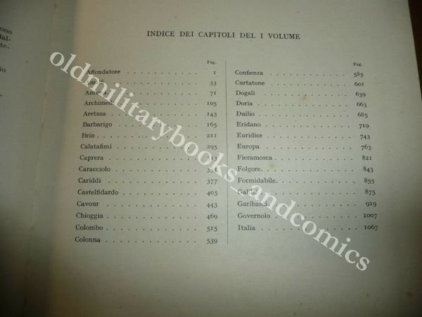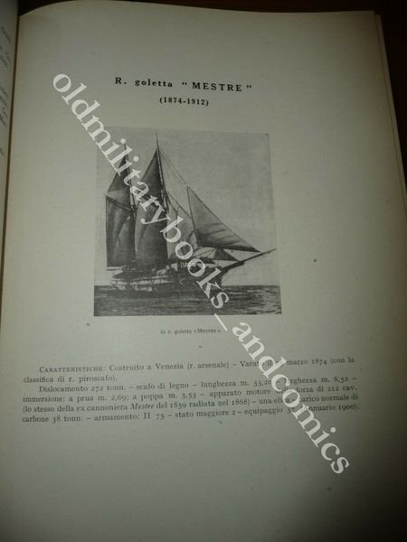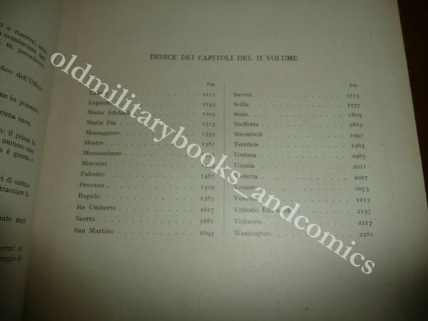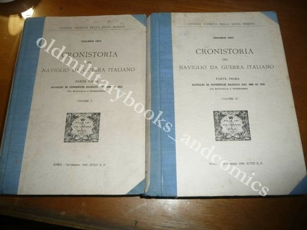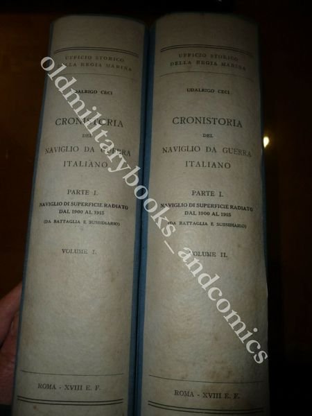 DESCRIZIONE: MINISTERO DELLA MARINA Roma 1940, br. ed. ca. con mezza tela originale al dorso ed agli angoli, due volumi XXXII-2311 pp. complessive in 8°. Naviglio di superficie radiato dal 1900 al 1915 (da battaglia e sussidiario). Ricchissimo repertorio: di ogni nave fornisce una foto, e completo resoconto tecnico e storico con molti dati e notizie. I volumi parlano delle 59 navi radiate dal servizio nel periodo indicato e per ognuna di esse la foto, varo e tutta la storia: missioni, esercitazioni, crociere, azioni di guerra praticamente la vita del naviglio italiano giorno per giorno. Due volumi veramente importanti per la completa conoscenza della storia della Marina Italiana. CONDIZIONI: Ottime/Perfette, piccola macchia in basso ad uno dei due vol. PESO / WEIGHT: 6000 gr. without package