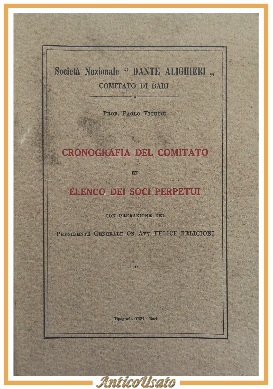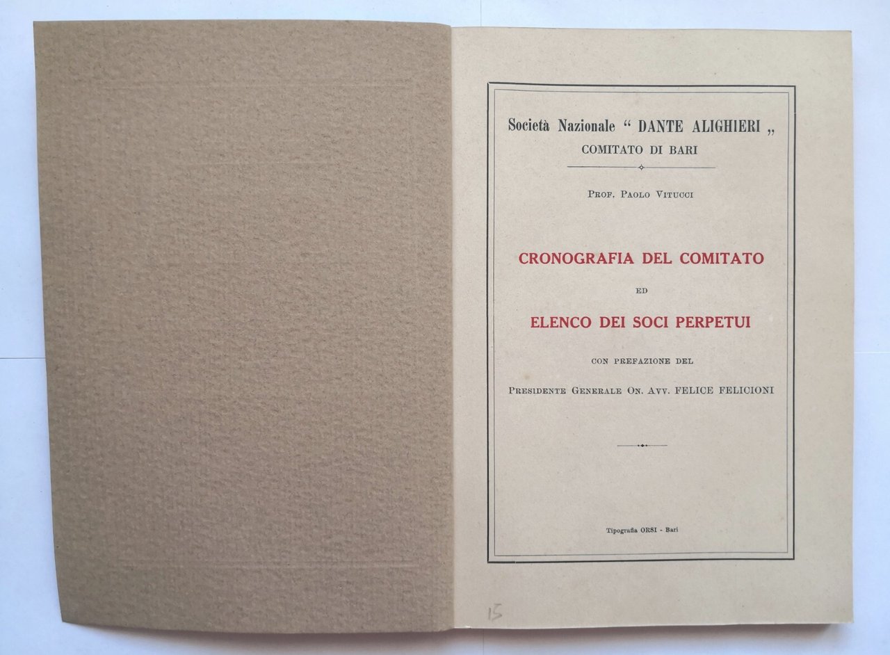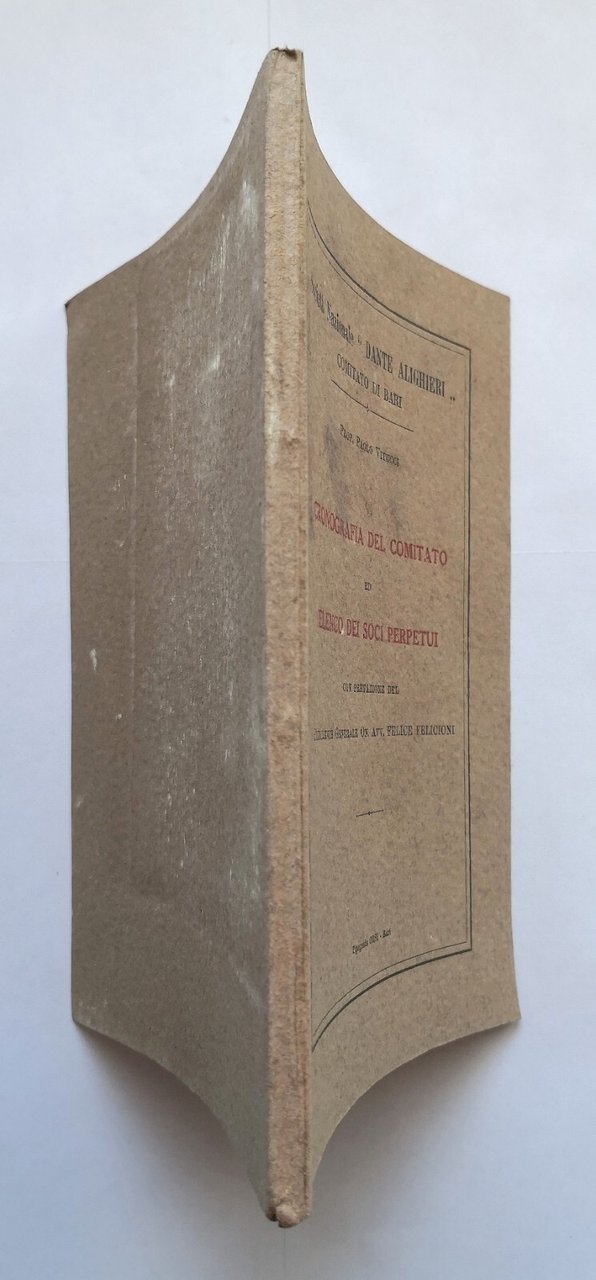 CRONOGRAFIA DEL COMITATO ED ELENCO DEI SOCI PERPETUI della Società Nazionale "Dante Alighieri", Comitato di Bari di Paolo Vitucci. Editore Tipografia ORSI, 1934. 81 pagine. Copertina editoriale in brossura. Stato di conservazione: molto buono (pagine normalmente ingiallite) Libro usato saggistica storia locale