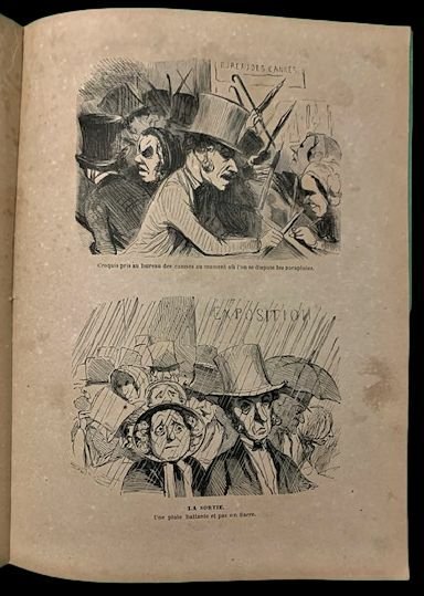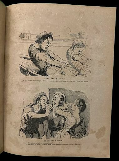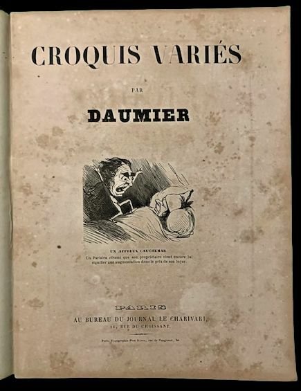 In 4° (23,8×18,1 cm); 16 cc. Brossura editoriale con titolo impresso in nero al piatto anteriore entro cornice. Esemplare leggermente ed uniformemente brunito, come tipico di tutti gli esemplari. Prima edizione di questa raccolta di tavole del celebre illustratore, scrittore, scultore. Litografo e caricaturista francese, Honoré Daumier (Marsiglia, 26 febbraio 1808 Valmondois, 10 febbraio 1879), celeberrimo per le sue vignette satiriche che prendevano di mira i personaggi politici dellepoca. Daumier, fin da giovanissimo, dimostrò una propensione al disegno. Nel 1825 fu apprendista della litografia Beliard, iniziando a collaborare, poi, con il giornale umoristico «La Silhouette» dimostrando, fin da subito, tutta la sua verve satirica. Fra le prime tavole che realizzò, una fece scalpore. In essa, il caricaturista opponeva il glorioso tricolore napoleonico alla restaurata bandiera borbonica. Limpegno politico di Daumier non si fermò alla carta ma prese parte attiva ai moti rivoluzionari che nel luglio del 1830 rovesciò la monarchia di Carlo X. Durante i moti fu colpito anche da un proiettile. Nel 1835 iniziò la collaborazione con il celebre giornale satirico diretto da da Charles Philipon e Gabriel Aubert «La Caricature» che gli diede fama e visibilità ma anche diversi problemi che lo portarono anche ad essere incarcerato per un vignetta troppo feroce verso Luigi Filippo I di Francia, già Luigi Filippo, duca dOrléans. Dumier negli anni successivi divenne uno dei più celebri illustratori di Francia, collaborando con giornali quali Le Charivari e La Chronique de Paris giornale fondato nel 1836 da Balzac che utilizzò il caricaturista anche per le immagini di alcune sue opere ed illustrando opere classiche e romanzi contemporanei, ottenendo un enorme successo. Non comune in questa prima edizione.