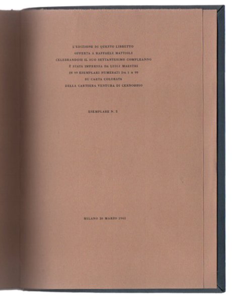 LIBROPrima edizione.Esemplare 2 di 99 numerati. In stato di nuovo.Edizione pregiata, offerta a Raffaele Mattioli da Alberto Vigevani per il settantesimo compleanno. Impressa da Luigi Maestri in 99 esemplari numerati su carta colorata.