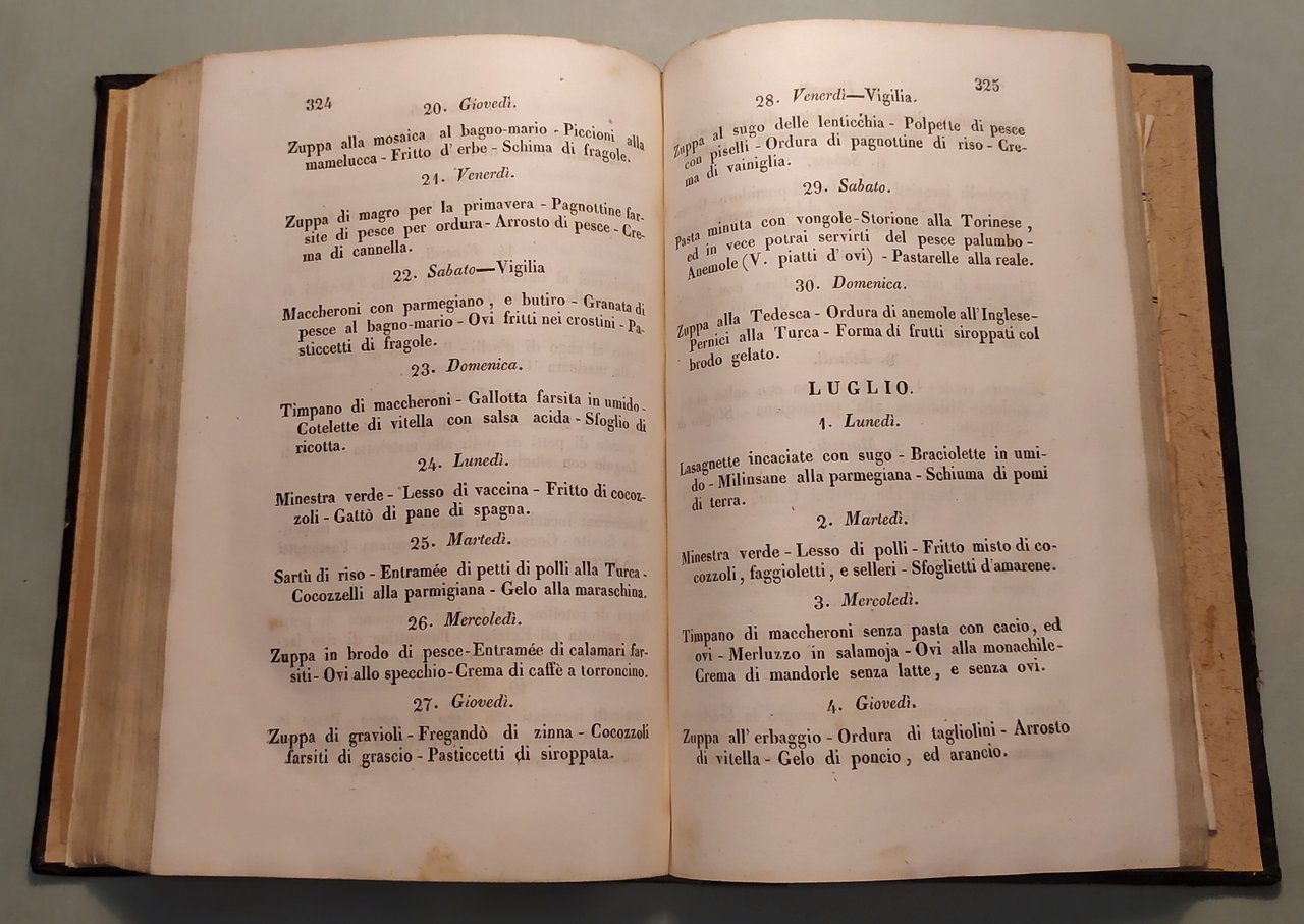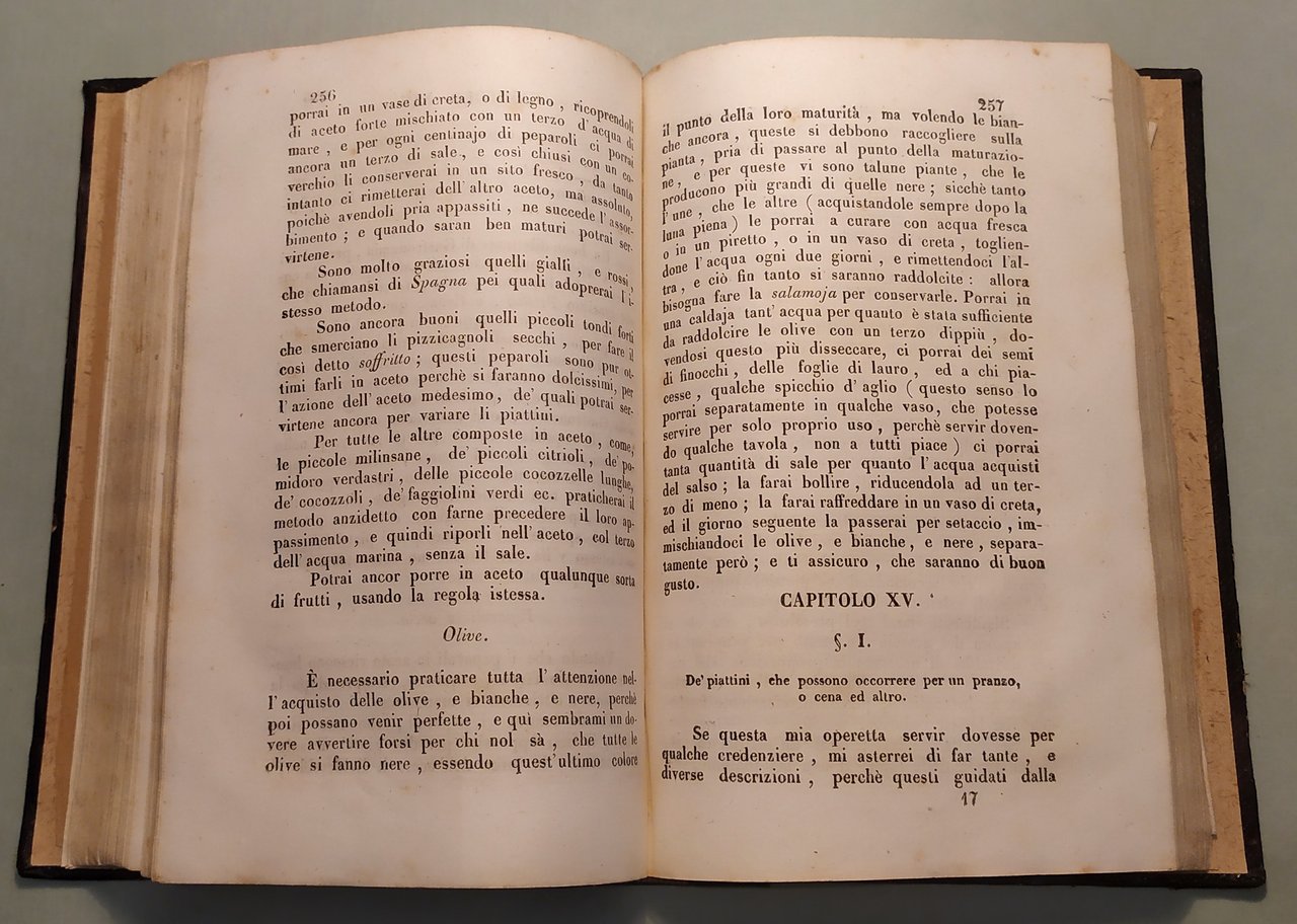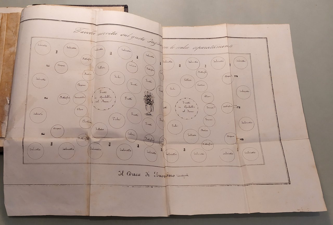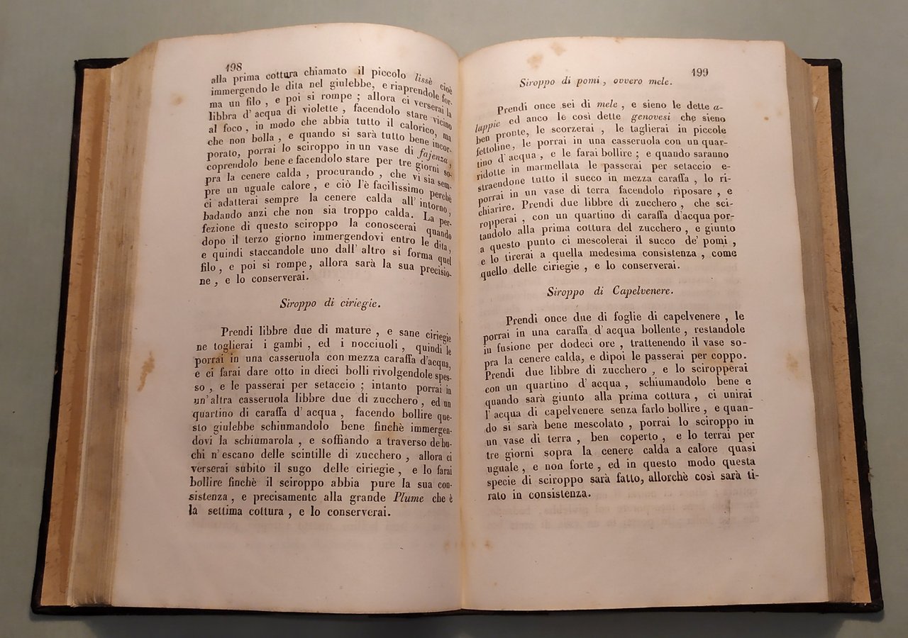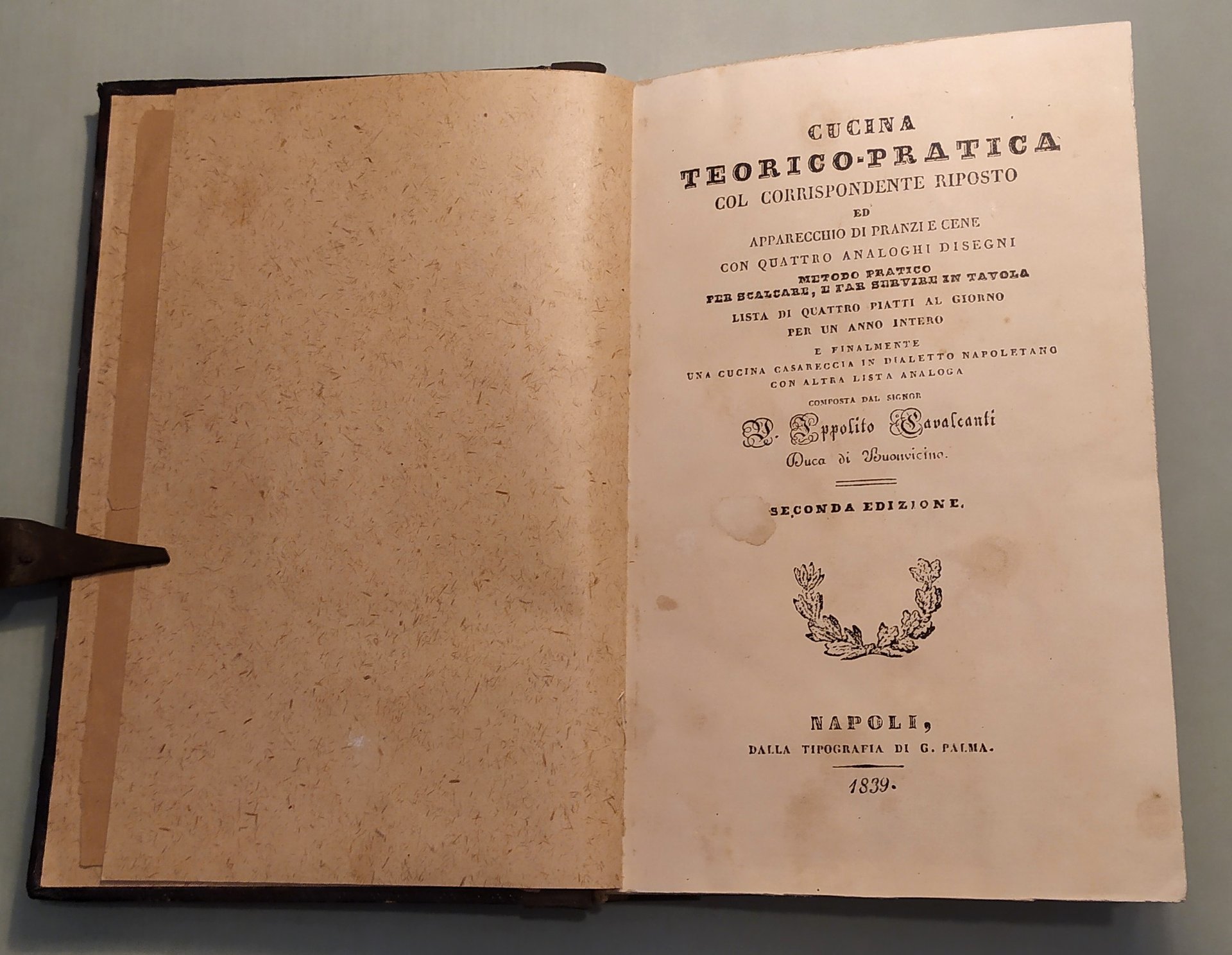 Napoli, dalla tipografia di G. Palma, 1839. In 8vo; pp.VIII,440. In fine quattro tavole spieghevoli. Ex libris. Mezza pella coeva, tassello al dorso con titolo in oro. Westbury, pag.44; Paleari Henssler, 585. Raro. “Ippolito duca di Buonvicino, apparteneva ad un’antica famiglia nobile che discendeva direttamente dal famosissimo Guido Cavalcanti, amico di Dante e poeta del dolce stilnovo. Con la sua opera seppe fotografare una parte rilevante della cucina napoletana dell’Ottocento. “Cucina teorico pratica”, scritta con stile semplice e immediato, note argute e interessanti osservazioni, venne pubblicata per la prima volta a Napoli nel 1837. Il Duca suddivise il manuale in due parti, compiendo un itinerario attraverso i diversi ceti sociali, fatto assai inusuale al tempo. La prima sezione venne redatta in lingua italiana, per nobili e ricchi borghesi. La seconda fu scritta in dialetto napoletano, per il popolo e la borghesia che usava il dialetto quale linguaggio quotidiano. Ippolito, oltre alle varie ricette, aggiunse in dialetto napoletano anche dei piatti per le ricorrenze importanti dell’anno: Natale, Capodanno, Pasqua ecc.” (taccuinistorici.it)