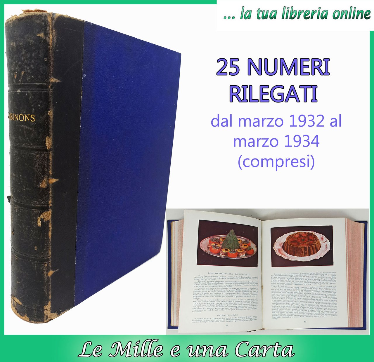 25 numeri della rivista di cucina, in lingua francese, rilegati insieme in un unico tomo (di dimensioni: 17,5 x 25 cm circa). I numeri inseriti nel volume sono stati privati delle copertine (iniziano tutti dalla prima pagina di testo: pagina 5).; I primi 8 numeri presenti terminano con pagina 34 (per cui non presentano l'ultima pagina dedicata all'indice). Dal nono numero in avanti, invece, sono presenti anche gli indici dei vari fascicoli mensili (che, quindi, terminano con pagina 36). A causa dell'esportazione delle copertine è stato difficile risalire alle date dei diversi numeri. Fortunatamente, però, il dodicesimo numero rilegato nel tomo presenta la pubblicità del X° SALON DES ARTS MENAGERS (Grand Palais, Paris) che si è tenuto dal 26 gennaio al 12 febbraio e con questa indicazione possiamo affermare che i numeri all'interno del volume vanno dal PRIMO NUMERO DELLA RIVISTA (marzo 1932) al 25° (del marzo 1934). Stato di conservazione: Qualche usura sulla copertina e, in particolare, sul dorso (che si presenta un po' consumato sui margine) ma, nel complesso, un buon esemplare. Fascicoli interni decisamente ben conservati. Nessun ascritta o sottolineatura nel testo. Numerosissime illustrazioni e disegni in bianco e nero e a colori. Il numero del dicembre 1933 non è costituito dalle classiche 36 pagine ma, bensì, da 52 pagine. LOTTO DI ASSAI DIFFICILE REPERIMENTO