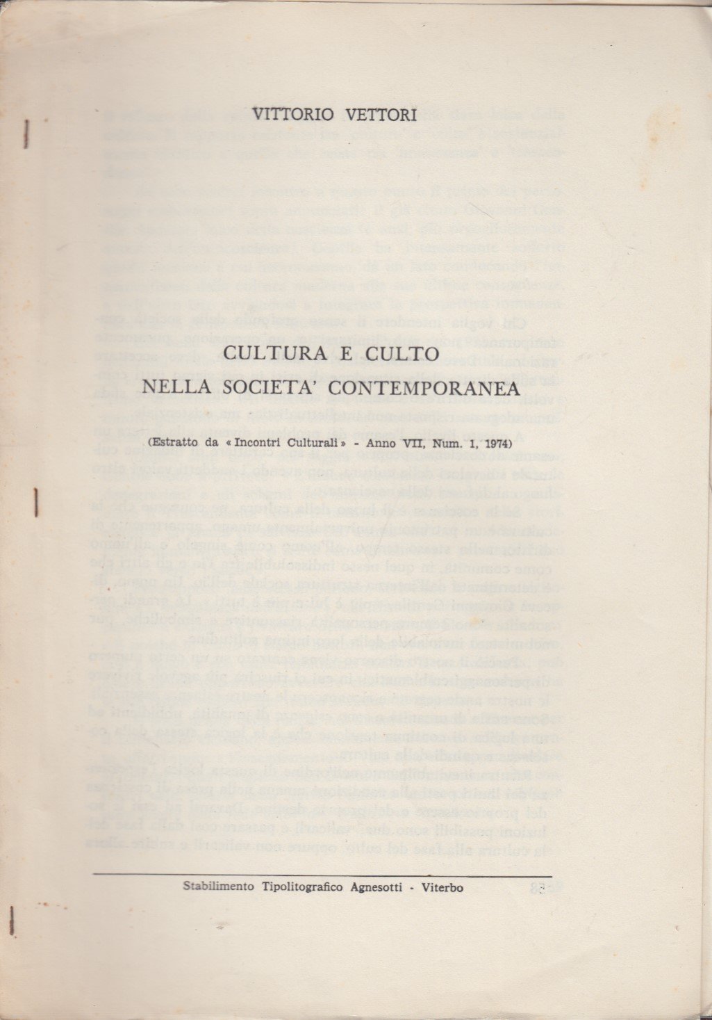 Estratto In-8 (Cm 24 x 17), pp. da 58 a 65. Estratto da Incontri Culturali, anno VII Num. 1, 1974. Pagine spillate. OTTIMO