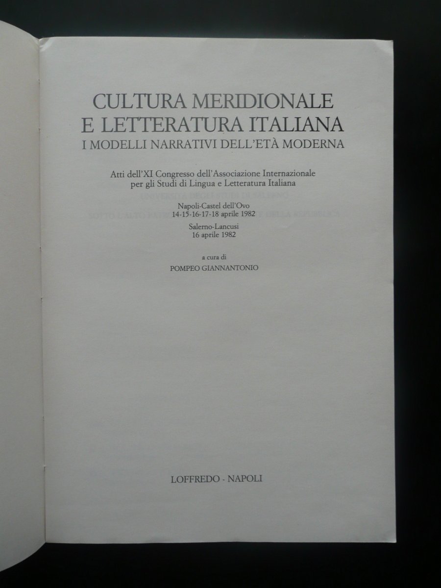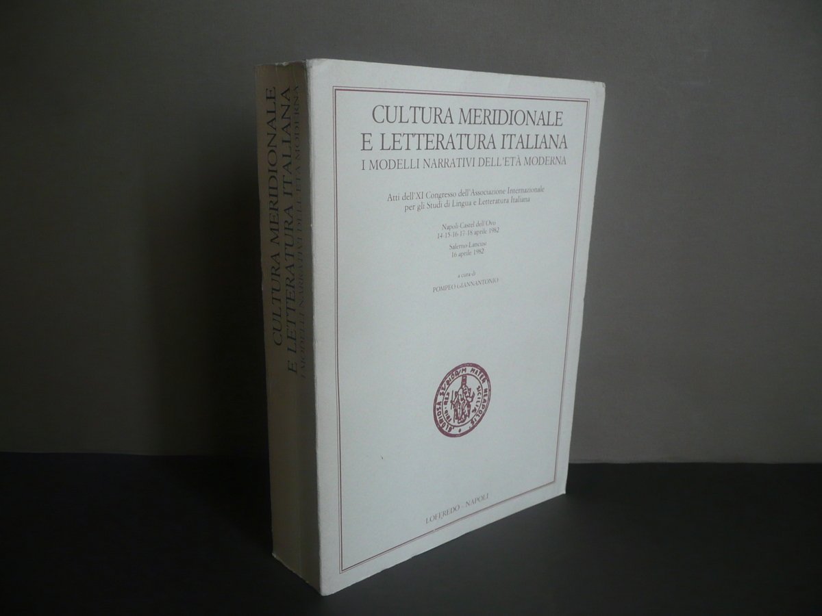 AA. VV., Cultura meridionale e letteratura italiana I modelli narrativi dell'età moderna Atti dell'XI Congresso dell'Associazione Internazionale per gli Studi di Lingua e Letteratura Italiana Napoli - Castel dell'Ovo 14 - 15 - 16 - 17 - 18 aprile 1982 Salerno - Lancusi 16 aprile 1982 a cura di Pompeo Giannantonio Loffredo, Napoli 1985, cm 24x17, pp. I-XVI; pp. 1-876; brossura ed. Condizioni di conservazione Esemplare in buone condizioni con tracce d'uso; angoli della br. post. con poche lievi tracce di pieghette; dorso con un leggero segno di utilizzo. Interni buoni; qualche pagina con poche leggere rimovibili sottolineature e/o annotazioni a matita; pp. 416-417 con una lieve fessurazione al margine int., esemplare saldo e compatto (vedi foto). SETT91.L8436 N