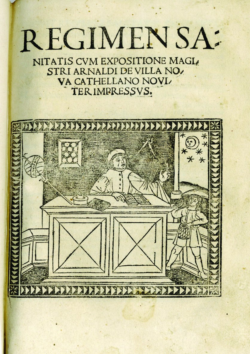 >in-4, ff. 60 non numerati, (segn. a-p4), legatura posteriore piena pergamena rigida, tit. ms. al dorso. Sul foglio di titolo magnifica grande silografia (mm 101x121) entro bordura ornata, raffig. un medico seduto in cattedra con libri e strumenti professionali, ed un discepolo in piedi davanti lui. . Testo in nitido car. romano racchiuso dal commento in car. leggermente più piccolo. Rara edizione (una delle varie impresse da Bernardino de Vitalibus senza data, ma tutte intorno al 1500) della celebre opera commentata da Arnaldo da Villa Nova, medico ed alchimista. Com'è noto il "Flos medicinae o Regimen sanitatis salernitanum", poemetto di 362 versi latini, è il più famoso testo medico-letterario lasciatoci dalla gloriosa Scuola Medica Salernitana (IX-XIV sec.), impresso in molte edizioni e tradotto in varie lingue. Oltre nozioni di medicina, contiene massime e suggerimenti per l'igiene e la buona salute personale, oltre che consigli dietetici e curiosità gastronomiche. Arnaldo, nato a Villa Nova, in Linguadoca, o più probabilmente in Catalogna, nel 1240, viene ricordato nella storia della medicina soprattutto per le acute osservazioni espresse in questo vasto Commento. Dopo aver studiato teologia, medicina e scienze a Parigi ed a Montpellier, insegnò medicina in questa città, ma, sospettato di eresia, dovette fuggire e subire l'ostracismo di parte della Chiesa. Mentre era medico ordinario di re Federico II di Sicilia fu chiamato da Clemente V alla corte papale di Avignone, ma morì durante il viaggio. Esempl. assai puro e marginoso. Goff R-80 . Klebs 830.16. Reicling 708. Essling 610. Sander III, 6389. IGI IV, n. 8305, note. .