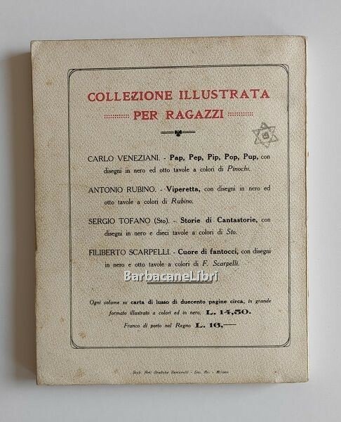 Romanzo per bambini e ragazzi con testi e bellissime illustrazioni a colori di Filiberto Scarpelli (1870-1933), celebre giornalista, illustratore e vignettista.