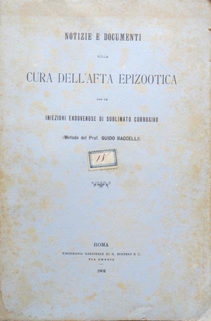 Tipografia Nazionale di G. Bertero e C., Roma, 1902. in 8vo, pp. 290, 1 tabella rip. n. t., bross. edit. in carta. L'afta epizootica è una malattia infettiva altamente contagiosa dei ruminanti e dei suini; prende il nome dalle lesioni ulcerose che lascia in bocca e nelle estremità distali degli arti degli animali colpiti (in ingleseè definita “foot and mouth disease”, malattia del piede e della bocca). Uniforme e spiccato ingiallimento dei fogli ma in buono stato di conservazione.