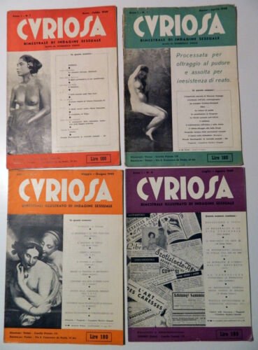 Collezione completa, di difficilissimo reperimento. Lotto comprensivo dei primi (ed unici!) 4 numeri di 'curiosa. Bimestrale illustrato di indagine sessuale diretto da domenico fusco / torino'; 'e' il documentario più serio ed originale sulla sessualità in ogni manifestazione dello spirito umano / la rivista è indispensabile ad ogni persona colta ed intelligente'; si tratta di una rivista 'scomoda' per l'argomento trattato ma che ebbe fin da subito un ampio successo (a pag. 1 del n. Ii si legge 'l'accoglienza del pubblico al primo numero di 'curiosa' si è dimostrata entusiastica e superiore ad ogni previsione: la tiratura, infatti, è stata letteralmente esaurita in una ventina di giorni, mentre doveva alimentare librerie ed edicole per due mesi. [.]'.; Dopo l'uscita del n. 4 (luglio-agosto 1949) la rivista e' stata chiusa e Domenico Fusco fu perseguitato dalle autorità fino al processo e alla condanna di alcuni mesi di reclusione per il possesso di libri osceni (cit. 'biografia di Domenico Fusco su archivium.info). In edicola, quindi, uscirono esclusivamente questi 4 numeri di 'curiosa'.; Sulla prima pagina del n. 3 'curiosa in tribunale' con la cronaca (di 2 pagine) del processo contro il direttore e l'amministratore della rivista.; 1) ANNO I -N. 1 - Genn. - Febbr. 1949; 2) Anno I N.2 - Marzo Aprile 1949; 3) Anno I N. 3 - Maggio - Giugno 1949; 4) Anno I N. 4 - Luglio - Agosto 1949.; Formato della rivista: 19 x 27,5 cm circa. Stato di conservazione: ordinari segni del tempo e dell'utilizzo. Il numero 2 (quello che presenta maggiori difetti di tutto il lotto) presenta un consistente taglio (di circa 9 cm) sul margine superiore del dorso della copertina, piccoli strappetti sul margine della copertina (in particolare uno strappetto senza mancanza di circa 3,5 cm) sul margine superiore della copertina posteriore (in corrispondenza a quel punto, le pagine interne - da pagina 10 fino all'ultimo foglio - presentano un'ammaccatura/stropicciatura e uno strappetto -meno consistente di quello della copertina posteriore -). Nel complesso, comunque, esemplari piu' che discretamente conservati. Privi di scritte, sottolineature, segni o pezzi di nastro adesivo.; Tutti e quattro i numeri sono ricchi di immagini in nero e presentano tavole illustrate fuori testo.; Gli articoli spaziano dalla sociologia, alla psicologia, all'arte, alla letteratura.; Dall'Esordio' a pag. 1 del Numero I: 'Curiosa, per lungo tempo meditata ed oggi realizzata su quello che fu il programma dell'ormai rarissimo ed introvabile Anthropophyteia del Dr. Ktauss, vuole, col suo titolo significativo, rendere omaggio a quell'appassionato studioso della letteratura italiana che fu Alcide Bonneau, autore, tra l'altro, di un'omonima raccolta di studi e saggi critici sulla letteratura erotica pubblicata nel 1887 dall'erudito ed editore parigino Isidore Liseux.; Se pensiamo al fenomeno grandioso, meraviglioso, della riproduzione della specie, elemento base della vita dell'universo, e lo poniamo in rapporto ad ogni manifestazione dello spirito, dobbiamo convenire come sia degno di studio sereno e di attento esame qualunque aspetto della sessualità umana. Non aggiungiamo nulla di nuovo, del resto, a quello che fu la teoria di Sigmund Freud [.]'; ALCUNI TRA VARI ARTICOLI PRESENTI:; Albert Valadier 'Lo scandalo Verlaine - Rimbaud'; Carlo Enrico Bertani 'Il diario psicanalitico di un quindicenne'; Ch. - H. Petiot 'Il museo segreto di Vittorio Emanuele II'; 'Il complesso di Edipo'; Charles Baudelaire 'Lesbos'; 'L'impotenza sessuale di Vincenzo Gonzaga'; Anselmo Botta-Serni 'L'erotismo nell'arte contemporanea'; Giovanni Vitarelli 'La prostitzione in Giappone'; Ilario D'andrea 'La libertà sessuale nell' U.R.S.S.'; Alberto Giacomelli 'L'esibizionismo nell'uomo e nella donna'; Alfonso Vivante 'L'ultimo oltraggio alla bella Draga'; Dino Origlia 'La psicanalisi e la vita coniugale'; Goliardo 'Il divorzio e la chiesa'; P.L. Franchi 'L'erotismo nell'arte di ierre Louys'; I. D'Andrea 'Ancora sulla corruzione sessuale nell'U.R.S.S.'; C.E. Bertani 'Documenti sulla prostituzione in Bologna'; iov. Colombini 'La corruzione attraverso la pubblicità'; P. Alvarez Currao 'Le aberrazioni sessuali nella guerra di Spagna'; B. B. 'Le separazioni legali in Italia dal 1914 al 1920'. Ogni numero si conclude con una 'piccola enciclopedia di curiosità sessuali'