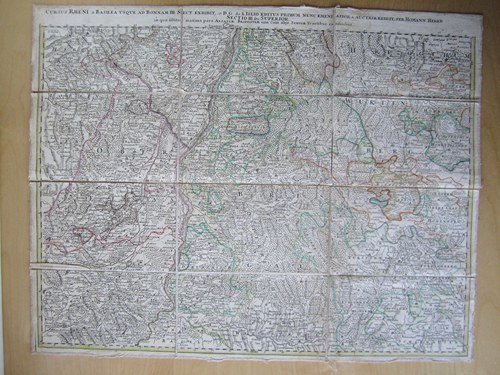 Cursus Rheni a Basilea usque Bonnam III Sect. exhibit. Sectio III seu Superiore in qua sistitur maxima pars Alsatiae, Brisgoviae una cum alijs Suevia Tractibus confinibus [ Colored Map with Basel, "Freyburg", Belfort, Muhlhausen, Strasbourg, Schafhausen, etc.