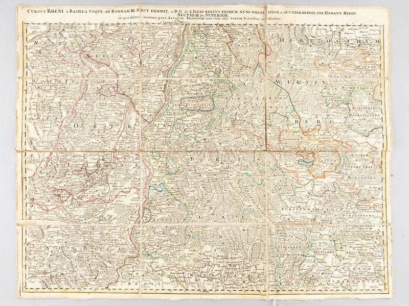 1 carte entoilée en coloris d'époque, format 49 x 69 cm, Homann Hered., s.d. (circa 1730) Etat très satisfaisant pour cette jolie carte en coloris d'époque, méritant encadrement.