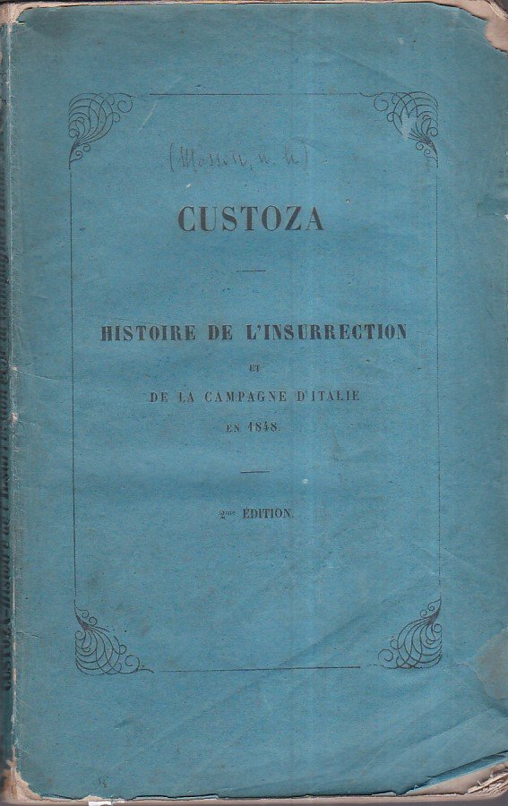 In-8°, pp. 168, brossura editoriale azzurra con titolo entro filetto tipografico con fregi angolari (piatto posteriore rifatto). In barbe, in buono stato. Seconda edizione, aumenta e corretta, di questo volume sui moti rivoluzionari italiani del 1848 e, in particolare, sulla prima battaglia di Custoza (frazione di Sommacampagna, presso Verona), combattuta tra il 22 e il 27 luglio 1848, durante la Prima Guerra di Indipendenza, tra le truppe piemontesi guidate da Carlo Alberto di Savoia e quelle austriache comandate da Radetzky. Manca il nome dell'autore, che è Alexandre Le Masson. Cfr. Bertarelli, 3984. Vismara, p. 112. Karcher, p. 25. Marchetti, Il 1848, 1638.