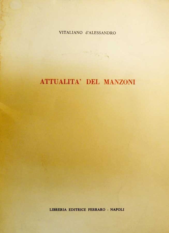 Vitaliano d'Alessandro, Attualità del Manzoni, Libreria Editrice Ferraro, Napoli 1973, pp. 42, cm 22, br. ed. Indice: Premessa storica (L'Urania - La conversione religiosa - Giansenismo? - Conversione letteraria) - Il mondo politico-sociale - Gli Inni Sacri - L'Adelchi - Il Cinque Maggio - Marzo 1821 - I Promessi Sposi (Lingua e stile - Il protagonista). Dedica manoscritta dell'autore alla prima pagina. Lieve gora al dorso, che non intacca l'interno del volume, per il resto ben conservato.