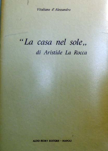 Vitaliano D’Alessandro, “La casa nel sole” di Aristide La Rocca, Aldo Fiory Editore, Napoli 1069, pp. 31, cm 21, opuscolo spillato. Presentazione e analisi critica della raccolta di versi La casa nel sole di Aristide La Rocca. Dedica manoscritta dell’autore al frontespizio. Lievissimi segni del tempo, per il resto perfetto. Estremamente raro.