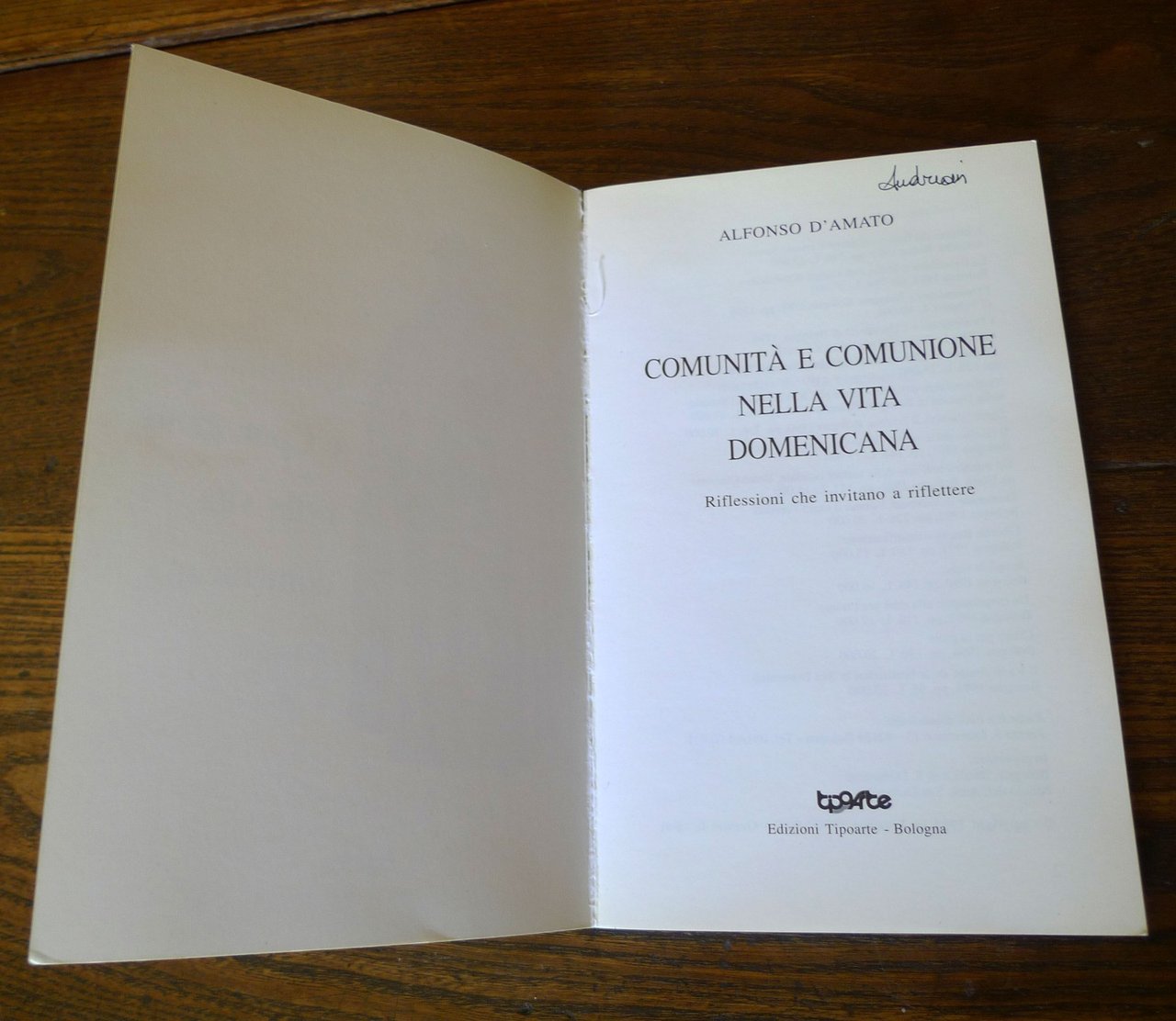 Alfonso D'Amato,COMUNITÀ E COMUNIONE NELLA VITA DOMENICANA.Riflessioni che invitano a riflettere.Edizioni Tipoarte, Ozzano E. (BO) 1995,brossura, 21x13 cm., pp.150,illustrazioni in bianco e nero,peso: g.300cod.9644CONDIZIONI DEL LIBRO: ottime,copertina leggermente ingiallita,firma al frontespizio