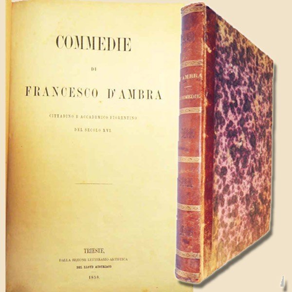 Commedie di Francesco D'Ambra cittadino e accademico fiorentino del secolo XVI, Sezione letterario-artistica del Lloyd Austriaco, Trieste 1858, pp. 127, cm 28, elegante legatura in mezza pelle coeva con titoli e fregi in oro e a impressione al dorso. Il volume comprende le commedie di F. D’Ambra: Il furto, I Bernardi, La cofanaria. Legato con: La suocera commedia di Benedetto Varchi con annotazioni, Lloyd Austriaco, Trieste 1858, pp. 42. Legato con: Commedie di Agnolo Firenzuola con annotazioni, Lloyd Austriaco, Trieste 1858, pp. 55 (La Trinuzia e I lucidi). Legato con: L’Aridosia commedia di Lorenzino De’ Medici esemplata sulle antiche rarissime stampe, con in fine l’apologia che lui scrisse di sè medesimo per aver ucciso Alessandro De’ Medici Duca di Firenze, Lloyd Austriaco, Trieste 1858, pp. 40. Legato con: La spina e Il granchio commedie di Lionardo Salviati accademico fiorentino ridotte a corretta lezione colla scorta delle stampe del Torrentino e de’ Giunti e copiosamente postillate, Lloyd Austriaco, Trieste 1858, pp. 83. Legato con: La Calanda commedia di Bernardo Dovizi cardinal da Bibiena recata a buona lezione colla scorta delle antiche stampe e postillata, Lloyd Austriaco, Trieste 1858, pp. 32. Timbro d’appartenenza a secco alla prima pagina di guardia. Lievissime abrasioni alla legatura, piatto posteriore impercettibilmente allentato, ma legatura ancora ben solida ed esemplare nel complesso ben conservato impreziosito da una pregevole legatura.