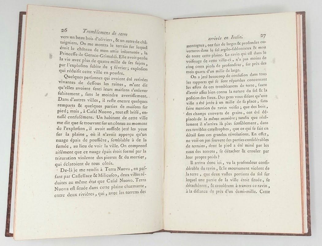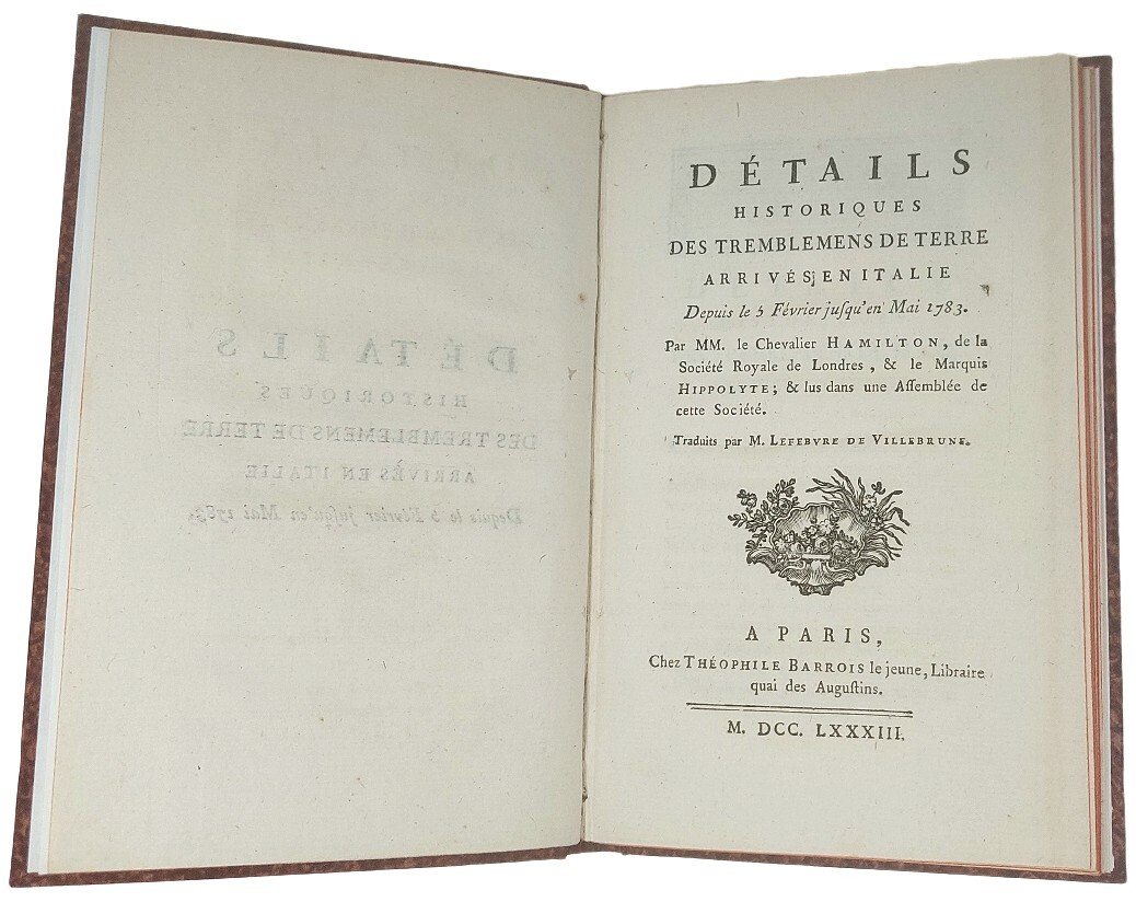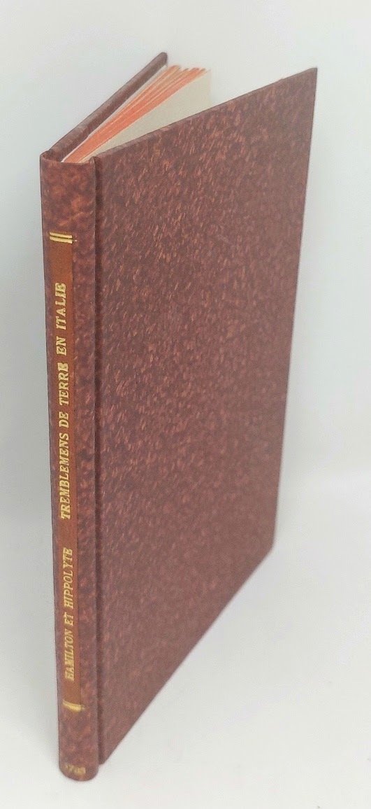 >in-8, (193x123 mm) (4), 75, (1)pp. Capolettera xilografico pag. A1r. Cartonato moderno, dorso con titolo longitudinale inciso in oro su tassello, tagli rossi. Un piccolo foro alla sguardia, che non intacca il testo. Alcune macchiette marginali. Rara traduzione francese, di Jean Baptiste Lefebvre de Villebrune (1732-1809), della relazione di Hamilton sulla tragedia del 1783 nell'Italia meridionale, comunicata il 23 maggio dall'ambasciatore britannico alla Royal Society e originariamente pubblicata sulle Philosophical Transactions (An Account of the earthquakes which happened in Italy). Buon esemplare fresco e marginoso. M. Sleep, Sir William Hamilton (1730-1803): His Work and Influence on Geology, “Annals of Science”, 25 (1969), pp. 319-338; J. Black, The Grand Tour in the Eighteenth Century, Stroud 1992; I. Jenkins-K. Sloan (eds.), Vases and Volcanoes. Sir William Hamilton and his Collections, London 1996 (in part. K. Sloan, Observations on the Kingdom of Naples. William Hamilton’s Diplomatic Career, pp. 24-39; and J. Thackray, The Modern Pliny, pp. 65-74); D. Constantine, Fields of Fire. A Life of Sir William Hamilton, London 2001.
