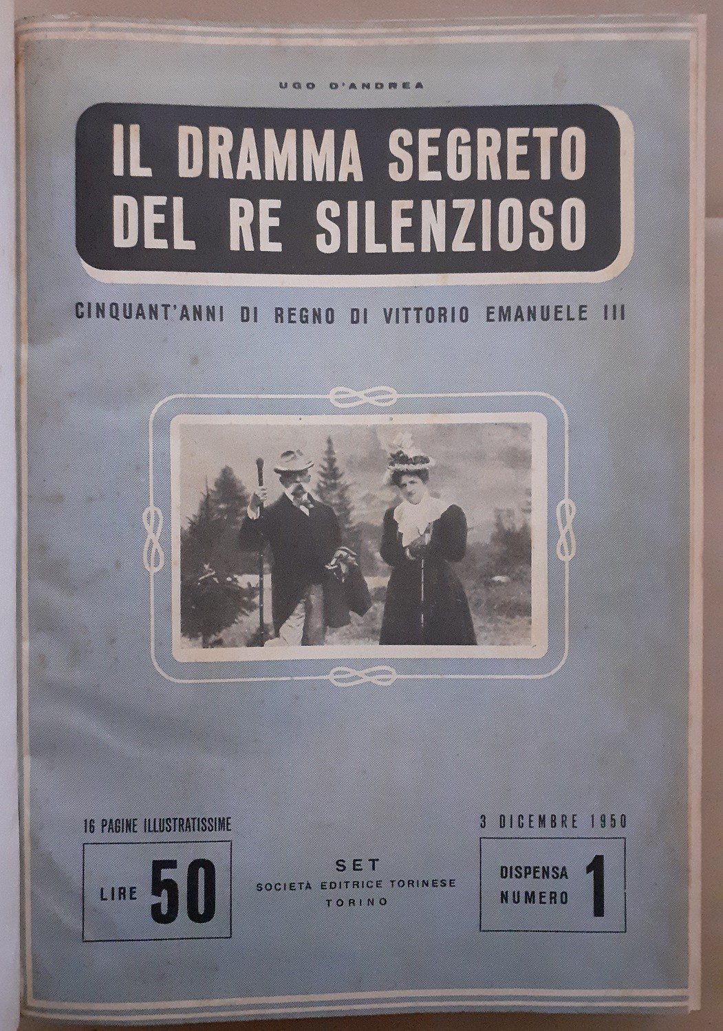 Ugo D’Andrea, Il dramma segreto del re silenzioso. Cinquant’anni di Regno di Vittorio Emanuele III, Set Società Editrice Torinese, Torino 1950-1951, pp. 440, ill. b.n., cm 30, legatura in mezza tela blu con angoli e titoli al dorso. Dispense rilegate. Leggere tracce d’uso alla legatura, fioriture marcate alle carte di guardia, uniforme brunitura della carta, per il resto esemplare molto ben conservato.