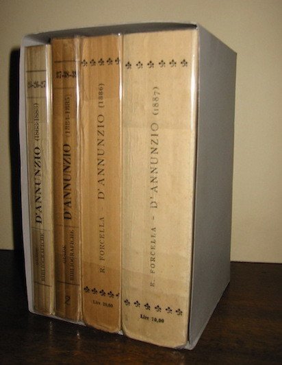 16mo (cm. 17,7), 4 Voll., 338 pp., 1 c.nn.; 368 pp., 1 c.nn.; 417(1) pp., 1 c.nn.; 621(1) pp., 1 c.nn. Brossure editoriali. Cop. anteriore del secondo volume parzialmente staccata, altrimenti ottimo esemplare prevalentemente a fogli chiusi. Raccolta completa delle Guide bibliografiche del Forcella su D’Annunzio. Il quarto volume è il 144 dei 200 esemplari numerati stampati su carta a mano. Raro insieme. Guabello, 469.