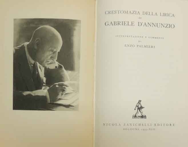 Crestomazia della lirica di Gabriele D’Annunzio, interpretazione e commento di Enzo Palmieri, Nicola Zanichelli Editore, Bologna 1935, pp. XI, 388, 9 c. di tavv. f.t. ill. b.n., cm 21, legatura in similpelle ed. con titoli in oro al dorso e taglio superiore spruzzato in oro. Tracce d’uso alla legatura, con minime abrasioni e cuffia superiore danneggiata, per il resto ben conservato.