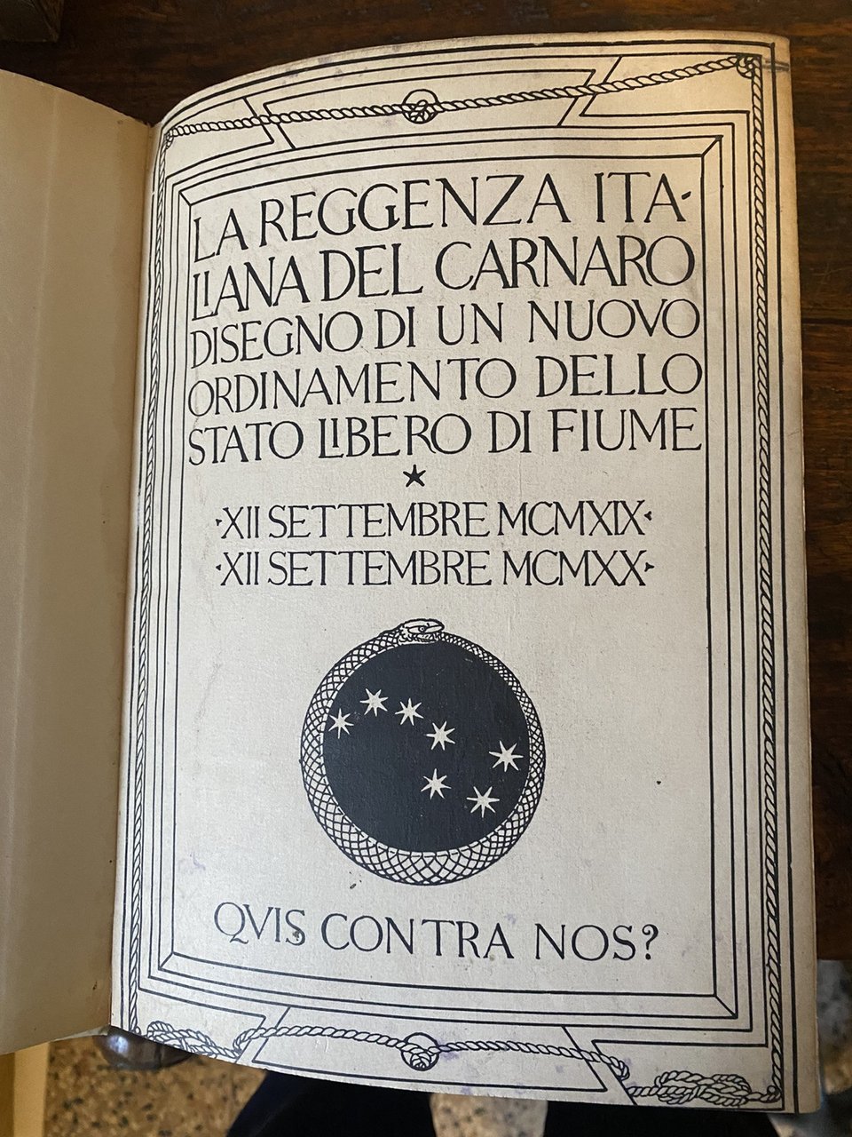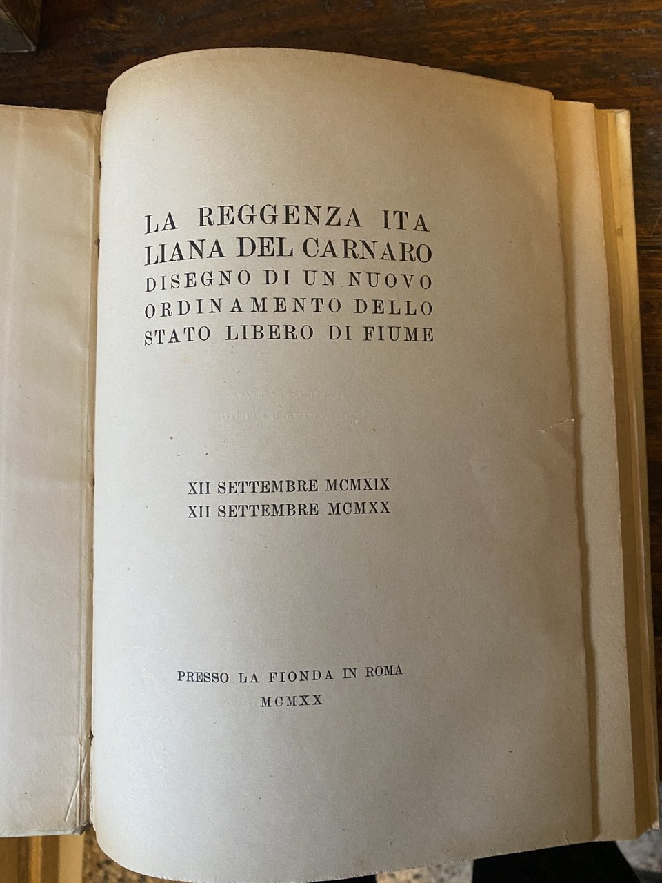 Disegno di un nuovo ordinamento dello Stato Libero di Fiume In 4° legatura cartonata coeva pp. 86 Pubblicata per la prima volta in un centinaio di esemplari il 27 agosto 1920; questa prima tiratura, pubblicata nel settembre del 1920, si distingue dalla precedente agli articoli XVIII e XXXV nei quali al posto di Reggenza troviamo il termine Repubblica Ottimo stato