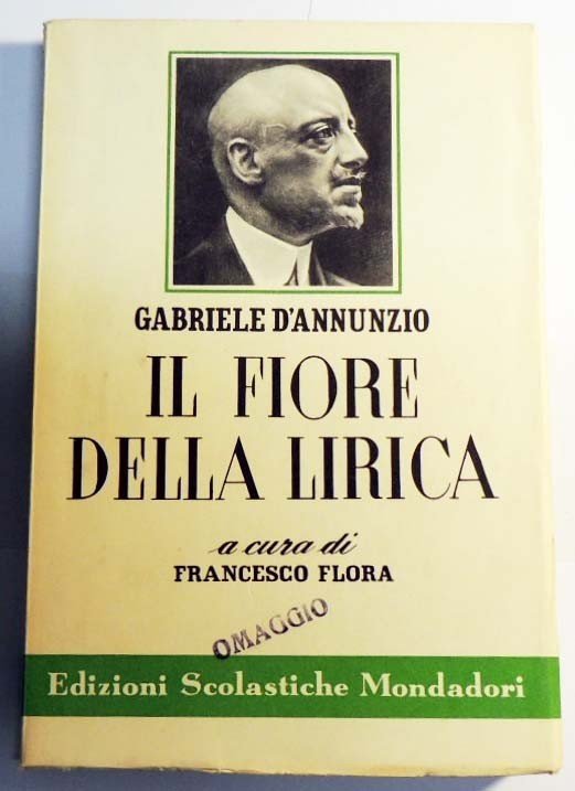 Gabriele D’Annunzio, Il fiore della lirica, con introduzione e note di Francesco Flora, Edizioni Scolastiche Mondadori, 1958, undicesima ed., pp. XII, 330, cm 20, br. ed. Timbro “Omaggio” sulla copertina, per il resto buona copia.