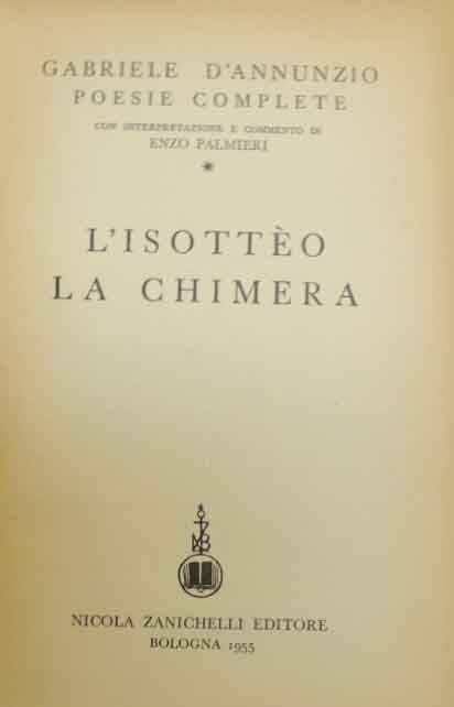 Gabriele D’Annunzio, L’Isottèo. La chimera, Nicola Zanichelli Editore, Bologna 1955, pp. XX, 398, cm 21, legatura in mezza tela muta. Collana Gabriele D’Annunzio. Poesie complete con interpretazione e commento di Enzo Palmieri. All’interno, alcune carte riportano riproduzioni di autografi del D’Annunzio. Ben conservato.